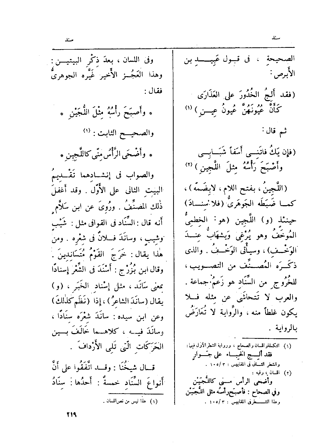 وَالصَّوَاب فِي إِسنادِهما تَقْدِمُ البيتِ الثَّانِي على الأَوّل. وَقد أَغفلَ ذالك المصنِّفُ. ورُوِيَ عَن ابْن سَلَّامٍ أَنه قَالَ: السِّنَاد فِي القوافي مثل: شَيْبٍ وشِيبٍ، وسانَدَ فلانٌ فِي شِعْرِه. وَمن هاذا يُقَال: خَرَجَ القَوْمُ مُتَسَانِدِينَ. وَقَالَ ابْن بُزُرْج؛ أَسْنَدَ فِي الشِّعْر إِسناداً بِمَعْنى سَانَد، مثل إِسْنادِ الخَبَرِ، (و) يُقَال (سانَدَ الشاعِرُ) ، إِذا (نَظَم كذالكَ) وَعَن ابْن سَيّده: سانَدَ شِعْرَه سِنَاداً، وسانَدَ فِيهِ، كِلَاهُمَا خَالَفَ بَين الحَرَكَاتِ الّتي تَلِي الأَرْدافَ.