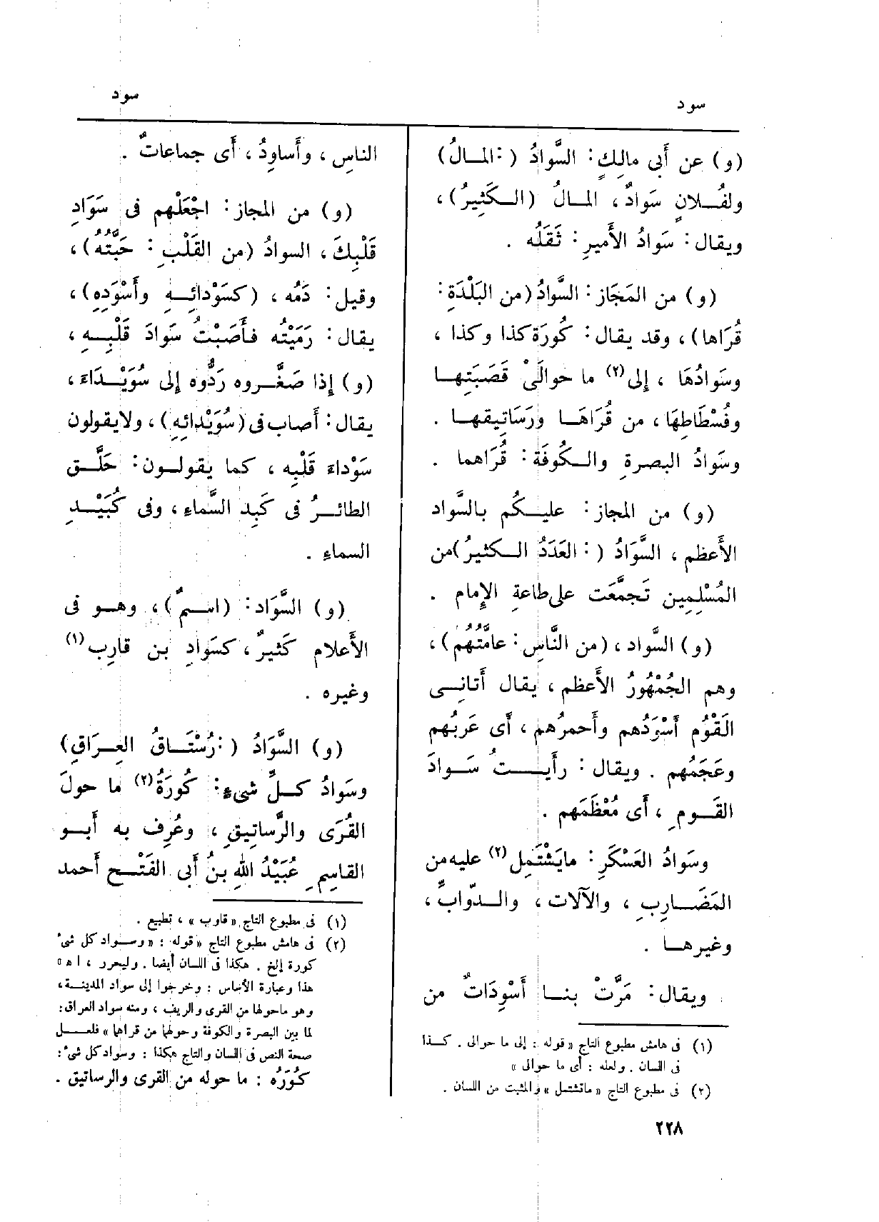 (و) مِنَ المَجَازِ: السَّوادُ (من البَلْدَةِ: قُرَاها) ، وَقد يُقَال: كُورَة كَذَا وَكَذَا، {وسَوادُهَا، إِلى مَا حوالَيْ قَصَبَتِها وفُسْطَاطِهَا، من قُرَاهَا ورَسَاتِيقها.} وسَوادُ البصرةِ والكُوفَة: قُرَاهما.