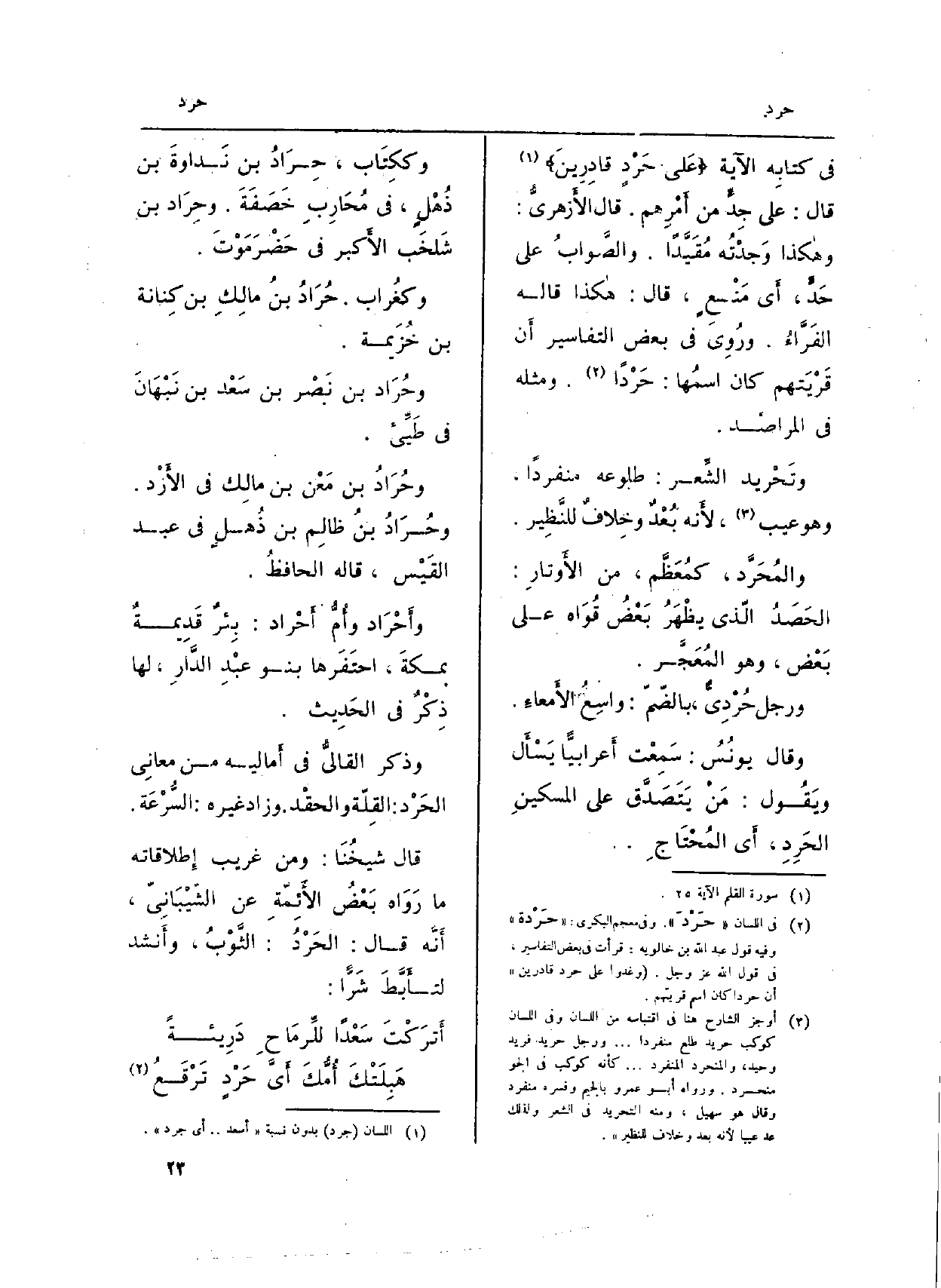 فِي كتابِه الْآيَة {عَلَى حَرْدٍ قَادِرِينَ} (الْقَلَم: 25) قَالَ: على جِدَ من أَمْرِهم. قَالَ الأَزهريُّ وهاكذا وَجدْتُه مُقَيَّداً. والصَّوابُ على حَدَ، أَي مَنْعٍ، قَالَ: هاكذا قَالَه الفَرَّاءُ. ورُوِيَ فِي بعض التفاسير أَن قَرْيَتهم كَانَ اسمُها: حَرْداً. وَمثله فِي المراصد.