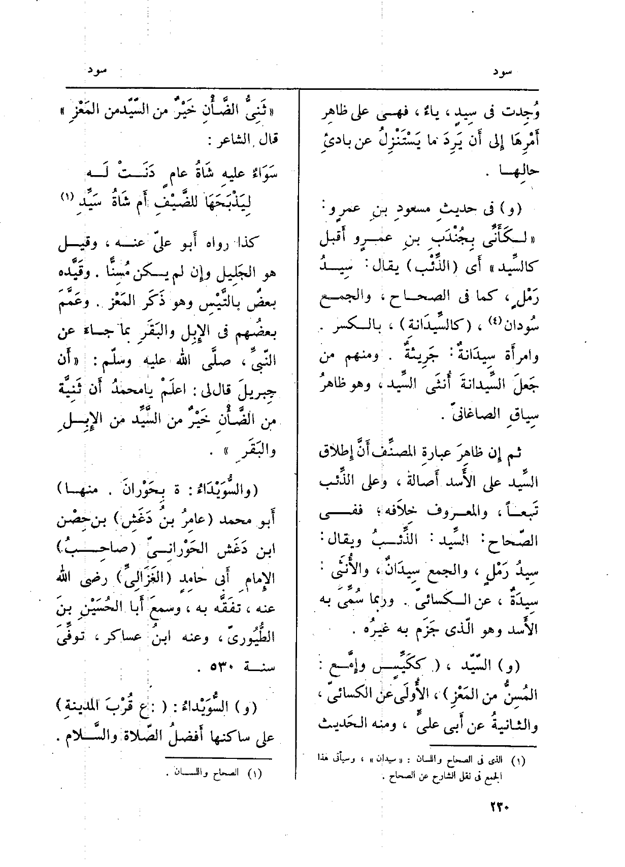 ثمَّ إِن ظاهرَ عبارةِ المصنِّف أَنَّ إِطلاق السِّيد على الأَسد أَصالة، وعَلى الذِّئب تَبعاً، وَالْمَعْرُوف خلَافه؛ فَفِي الصّحاح: السِّيد: الذِّئبْ وَيُقَال: سِيدُ رَمْلٍ، وَالْجمع} سِيدَانٌ، والأُنثَى: {سِيدَةٌ، عَن الكسائيّ. وَرُبمَا سُمِّيَ بِهِ الأَسد وَهُوَ الّذي جَزَم بِهِ غيرُه.