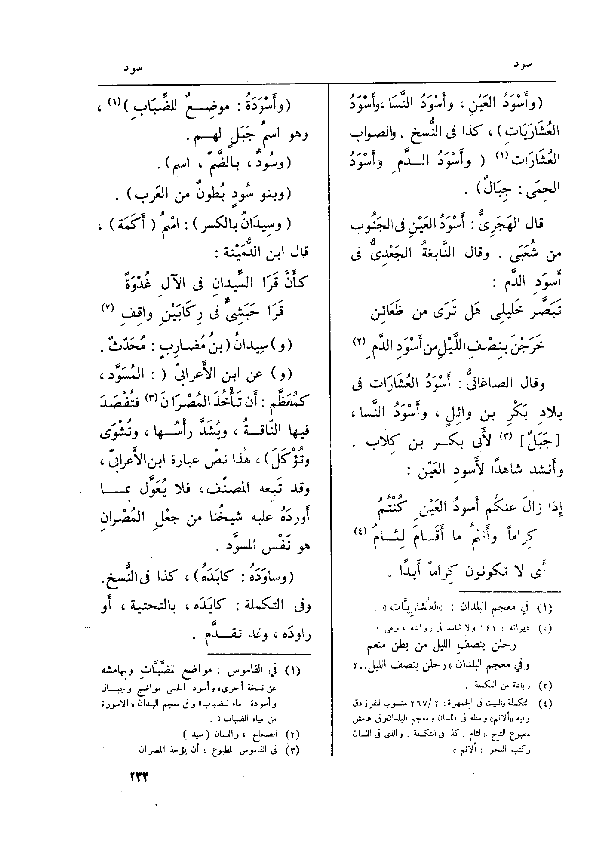 وَقَالَ الصاغانيُّ: أَسْوَدُ العُشَارَات فِي بلادِ بَكْرِ بن وائِلٍ، وأَسْوَدُ النَّسا، (جَبَلٌ) لأَبي بكر بن كِلاب. وأَنشد شَاهدا {لأَسودِ العَيْن: