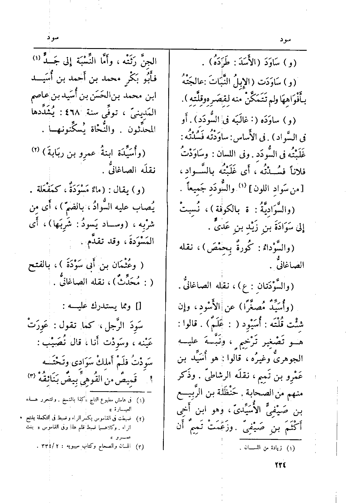 ( {وأُسَيِّدٌ مُصغَّراً) عَن} الأَسْودِ، وإِن شِئْت {أُسَيْوِد: (عَلَمٌ) : قَالُوا: هُوَ تَصْغِير تَرْخِيمٍ، ونَبَّهَ عَلَيْهِ الجوهريُّ وغيرُه، قَالُوا: هُوَ أُسَيِّد بن عَمْرِو بن تَمِيم، نقلَه الرطاشيّ. وذَكر مِنْهُم من الصَّحَابَة. حَنْظَلة بن الرَّبِيع بن صَيْفِيَ الأُسَيِّديّ، وَهُوَ ابْن أخِي أكْثَمَ بنِ صَيْفِيّ. وزَعَمَتْ تَمِيمٌ أَن الجِنَّ رَثَتْه، وأَمَّا النِّسْبَة إِلى جَدَ فأَبُو بَكْرٍ مُحَمَّد بن أَحمد بن أُسَيد بن مُحَمَّد بن الحَسَن بن أُسَيد بن عَاصِم المَدِينيّ توفِّي سنة 468 هـ: يُشَدِّدها المحدِّثون. والنُّحْاة يُسكِّنونها.