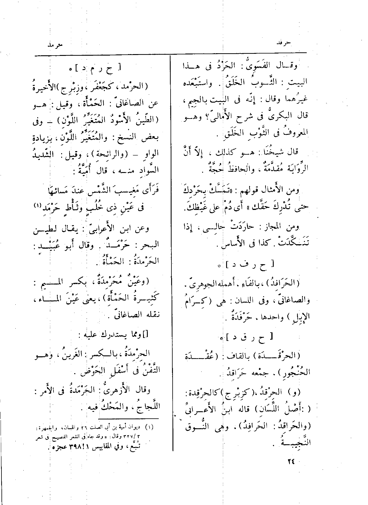 : (الحرْمد، كجَعْفَر، وزِبْج) الأَخيرةُ عَن الصاغانيّ: الحَمْأَة، وَقيل: هُوَ (الطّينُ الأَسْودُ المُتَغَيِّرُ اللَّوْنِ) وَفِي بعض النّسخ: والمُتِغَيِّرُ اللَّوْنِ، بزيادةِ الواوِ (والرائِحةِ) ، وَقيل: الشّديدُ السَّوادِ مِنْهُ، قَالَ أُمَيَّةُ: