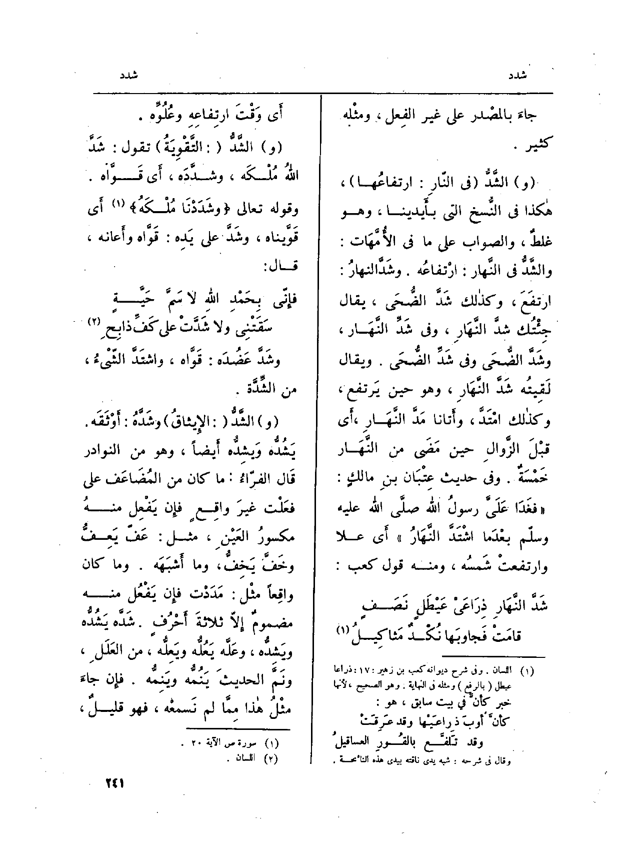 (و) الشَّدُّ (فِي النّارِ: ارتفاعُها) ، هاكذا فِي النُّسخ الَّتِي بأَيدينا، وَهُوَ غلطٌ، وَالصَّوَاب على مَا فِي الأُمَّهَات: والشَّدُّ فِي النَّهار ارْتفاعُه. وشَدَّ النهارُ: ارتفَعَ، وكذالك شَدَّ الضُّحَى، يُقَال جِئْتُك شدَّ النَّهَارِ، وَفِي شَدِّ النَّهَار، وَفِي شَدِّ النَّهَار، وشَدَّ الضُّحَى وَفِي شَدِّ الضُّحَى. وَيُقَال لَقِيتُه شَدَّ النَّهَارِ، وَهُوَ حِين يَرتفع، وكذالك امْتَدَّ، وأَتانا مَدَّ النَّهَارِ، أَي قبْلَ الزَّوالِ حِين مَضَى من النَّهَار خَمْسَةٌ. وَفِي حَدِيث عِتْبَان بنِ مالكٍ: (فغَدَا عَلَيَّ رسولُ الله صلَّى الله عليْه وسلّم بعْدَما اشْتَدَّ النَّهَارُ) أَي علا وارتفعتْ شَمسُه، وَمِنْه قَول كَعْب: