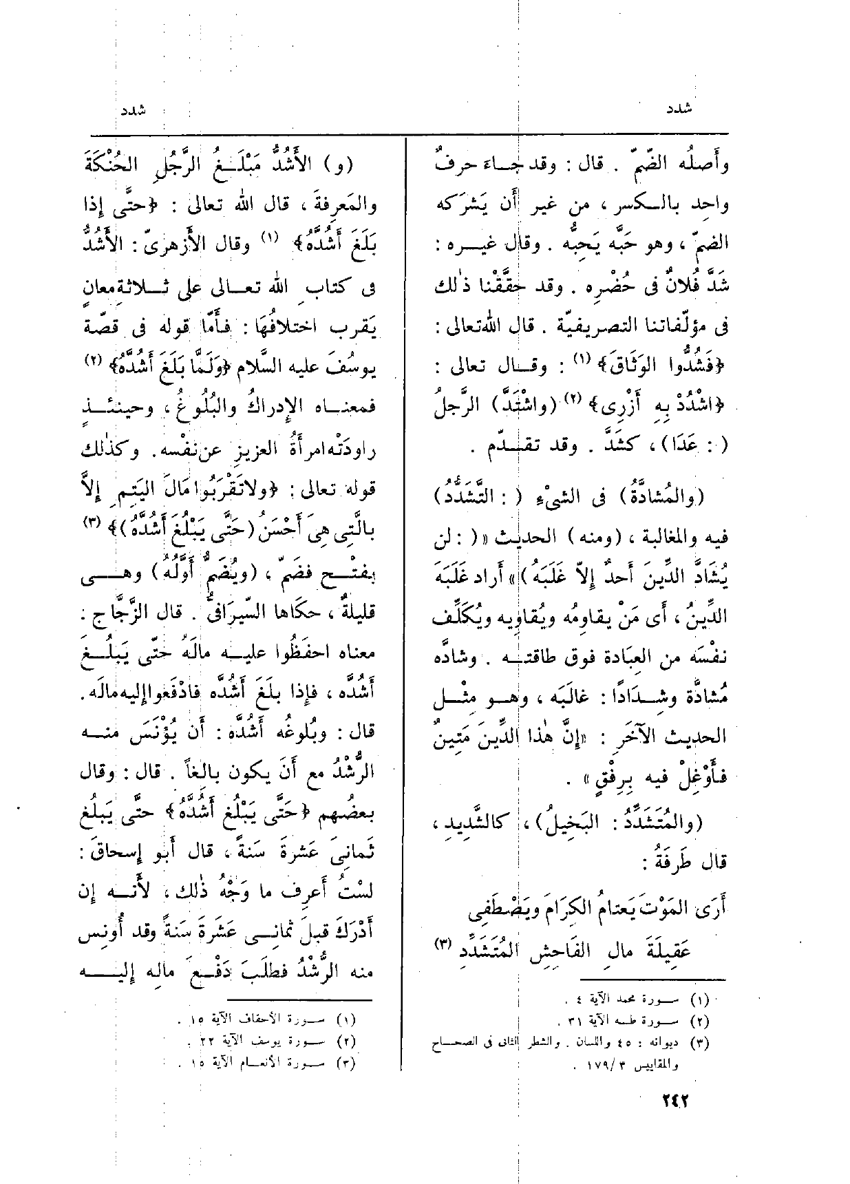 (و) {الأَشُدُّ مَبْلَغُ الرَّجُلِ الحُنْكَةَ والمَعرِفةَ، قَالَ الله تَعَالَى: {حَتَّى إِذَا بَلَغَ} أَشُدَّهُ} (الْأَحْقَاف: 15) وَقَالَ الأَزهريّ: {الأَشُدُّ فِي كتابِ الله تَعَالَى على ثلاثةِ معانٍ يَقرب اختلافُهَا: فأَمّا قَوْله فِي قصّة يوسُفَ عَلَيْهِ السَّلام {وَلَمَّا بَلَغَ} أَشُدَّهُ} (يُوسُف: 22) فَمَعْنَاه الإِدراكُ والبُلُوغُ، وحينئذٍ راودَتْه امرأَةُ العزيزِ عَن نفْسه. وكذالك قَوْله تَعَالَى: {حَتَّى يَبْلُغَ أَشُدَّهُ} (الْأَنْعَام: 15) بفتْح فضَمّ، (ويضَمُّ أَوَّلُهُ) وَهِي قليلةٌ، حكَاها السّيرَافيُّ. قَالَ الزَّجَّاجِ: مَعْنَاهُ احفَظُوا عَلَيْهِ مالَهُ حتّى يَبلُغَ أَشُدَّه، فإِذا بلَغَ أَشُدَّه فادْفَعوا إِليه مالَه. قَالَ: وبُلوغُه أَشُدَّه: أَن يُؤْنَسَ مِنْهُ الرُّشْدُ مَعَ أَنَ يكون بالِغاً. قَالَ: وَقَالَ بعضُهم {حَتَّى يَبْلُغَ أَشُدَّهُ} حتَّى يَبلُغ ثَمانِيَ عَشرةَ سَنةً، قَالَ أَبو إِسحاقَ: لسْتُ أَعرِف مَا وَجْهُ ذالك، لأَنه إِن أَدْرَكَ قبلَ ثمانِي عَشَرةَ سَنةً وَقد أُونِس مِنْهُ الرُّشْدُ فطلَبَ دَفْعَ مالِه إِليه