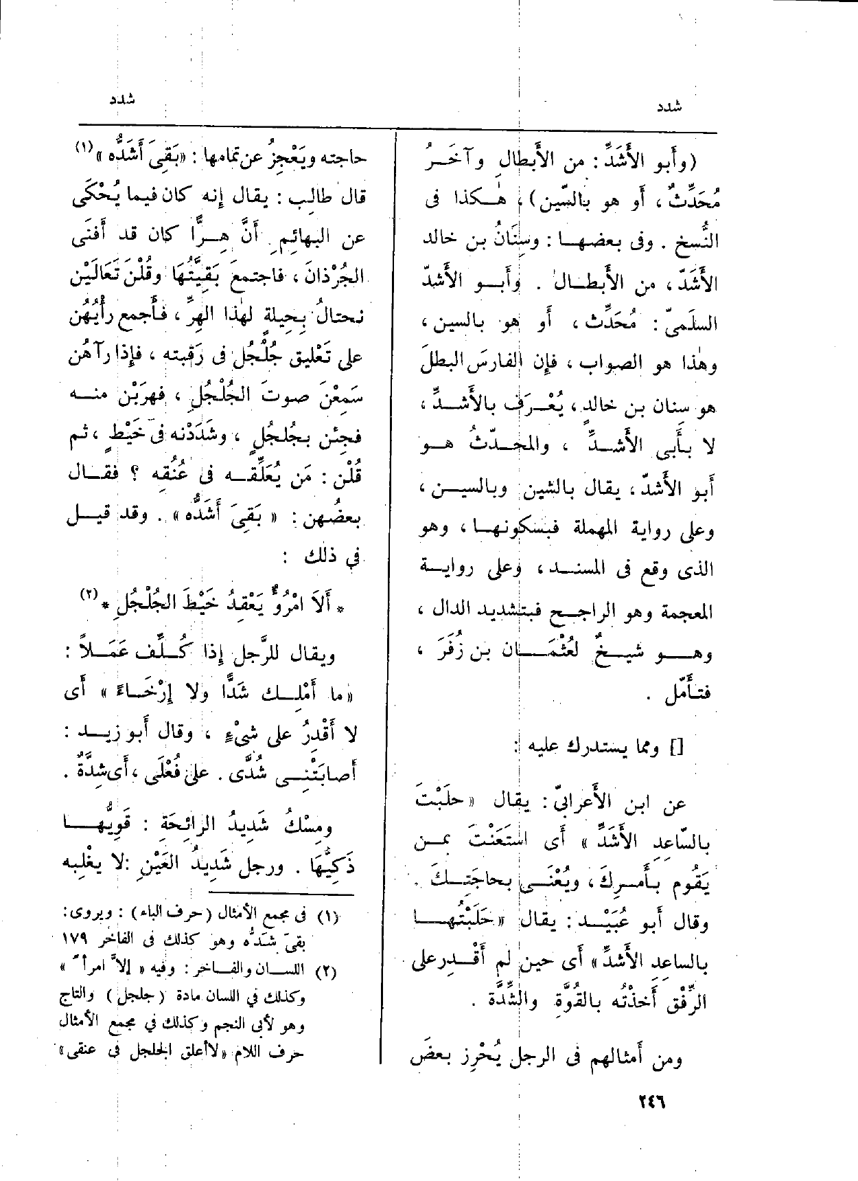 وَمن أمثالهم فِي الرجل يُحْرِز بعضَ حَاجته ويَعْجِزُ عَن تَمامهَا: (بَقِيَ أَشَدُّه) قَالَ طالِب: يُقَال إِنه كَانَ فِيمَا يُحْكَى عَن البهائِمِ أَنَّ هِرًّا كَانَ قد أَفنَى الجُرْذانَ، فاجتمعَ بَقِيَّتُهَا وقُلْنَ تَعَالَيْن نحتالُ بِحِيلة لهاذا الهِرِّ، فأَجمع رأْيُهُن على تَعْليق جُلْجُل فِي رَقبته، فإِذا رآهُن سَمِعْنَ صوتَ الجُلْجُلِ، فهرَبْن مِنْهُ فجِئن بجُلجُلٍ،} وشَدَدْنه فِي خَيْطٍ، ثمَّ قُلْن: مَن يُعَلِّقه فِي عُنُقِه؟ فَقَالَ بعضُهن: (بَقِيَ أَشَدُّه) . وَقد قيل فِي ذَلِك: