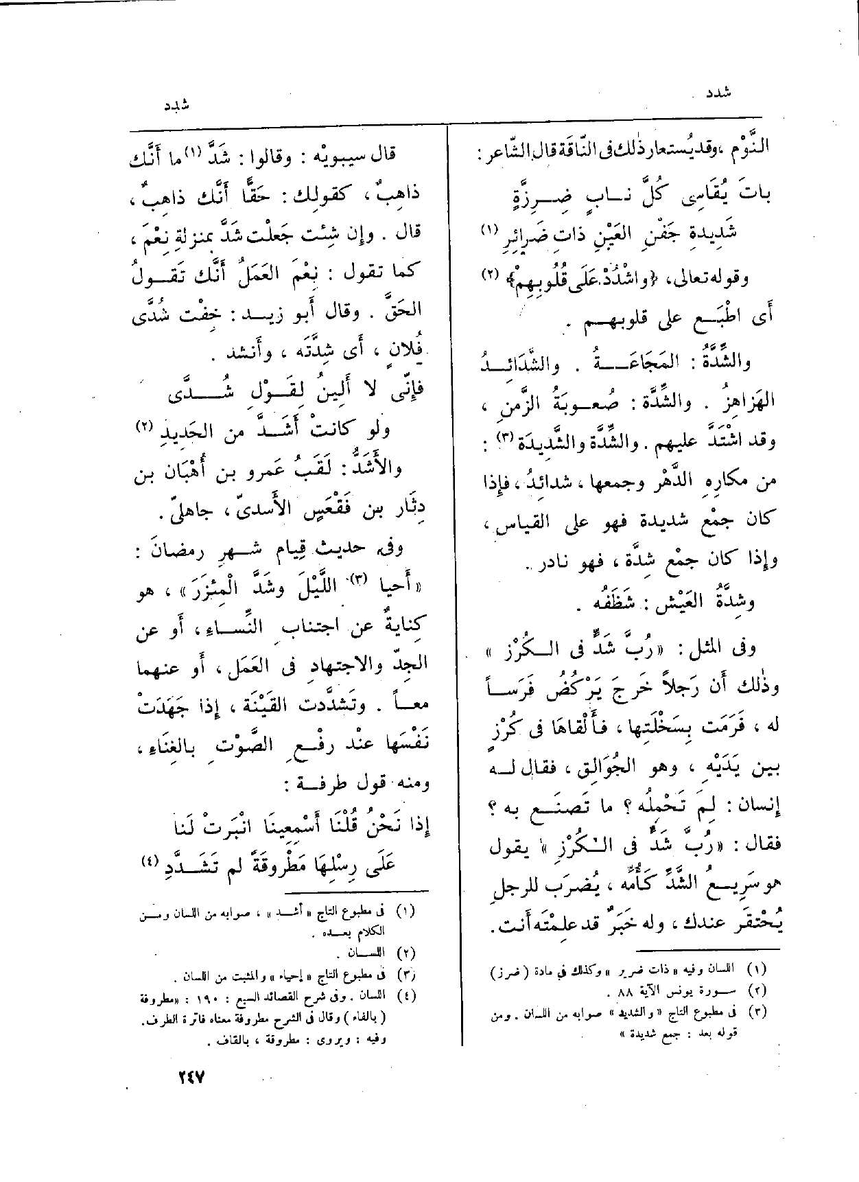 } والشِّدَّةُ: المَجَاعَةُ. والشَّدَائِدُ الهَزاهِزُ. والشِّدَّة: صُعوبَةُ الزَّمنِ، وَقد اشْتَدَّ عَلَيْهِم. والشِّدَّة والشَّدِيدَة: من مكارِهِ الدَّهْر وَجَمعهَا، شدائِدُ، فإِذا كَانَ جمْع شَدِيدَة فَهُوَ على الْقيَاس، وإِذا كَانَ جمّع شِدَّة، فَهُوَ نَادِر.