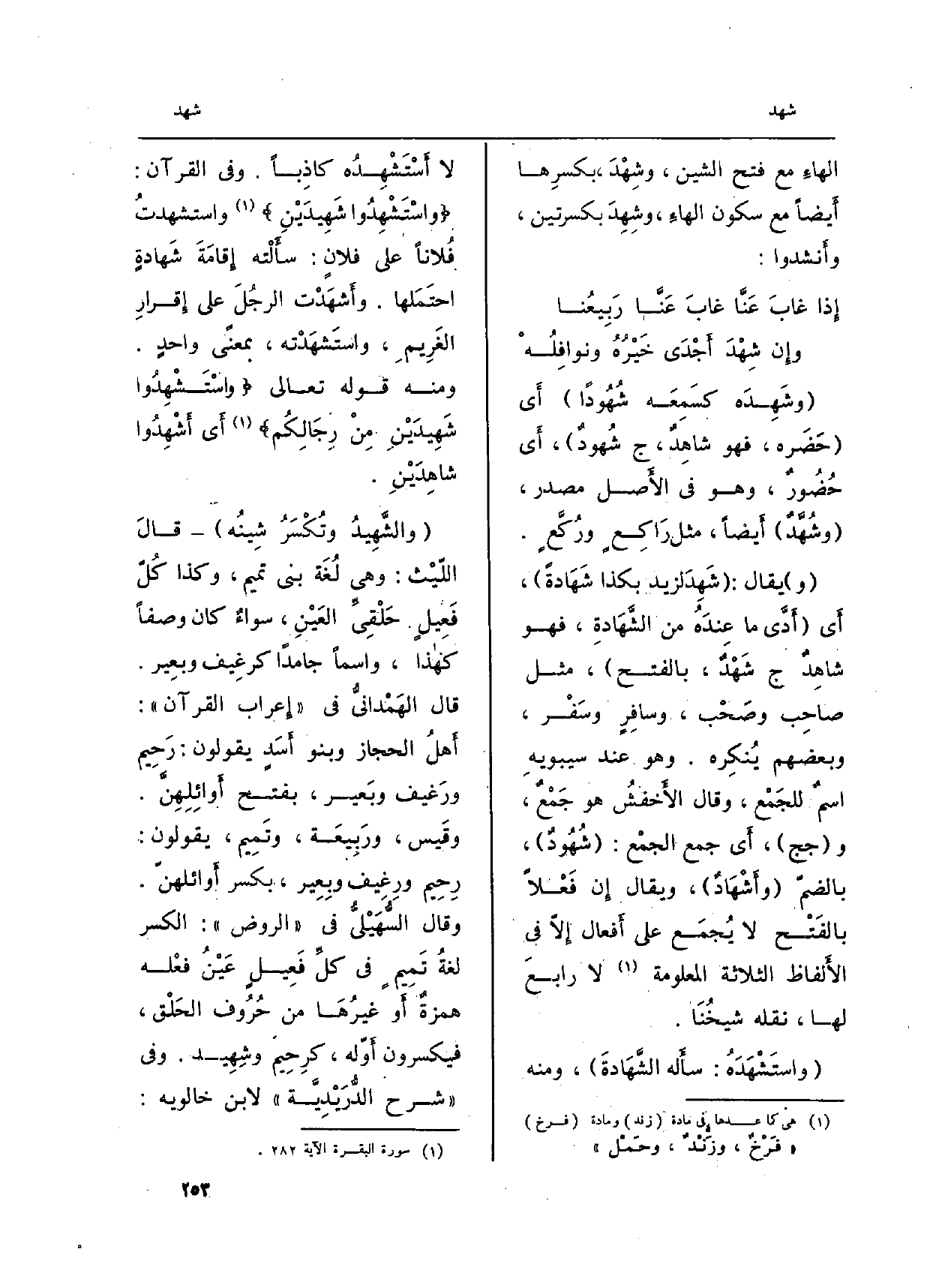 (واستَشْهَدَهُ: سأَله الشَّهَادةَ) ، وَمِنْه لَا أَسْتَشْهِدُه كاذِباً. وَفِي الْقُرْآن: {وَاسْتَشْهِدُواْ شَهِيدَيْنِ} (الْبَقَرَة: 282) واستشهدتُ فُلاناً على فلانٍ: سأَلْته إِقامَةَ شَهادةٍ احتَمَلها. وأَشهَدّت الرجُلَ على إِقرارِ الغَرِيمِ، واستَشهَدْته، بِمَعْنى واحدٍ. وَمِنْه قَوْله تَعَالَى: {وَاسْتَشْهِدُواْ شَهِيدَيْنِ مّن رّجَالِكُمْ} (الْبَقَرَة: 282) أَي أَشْهِدُوا شاهِدَيْنِ.