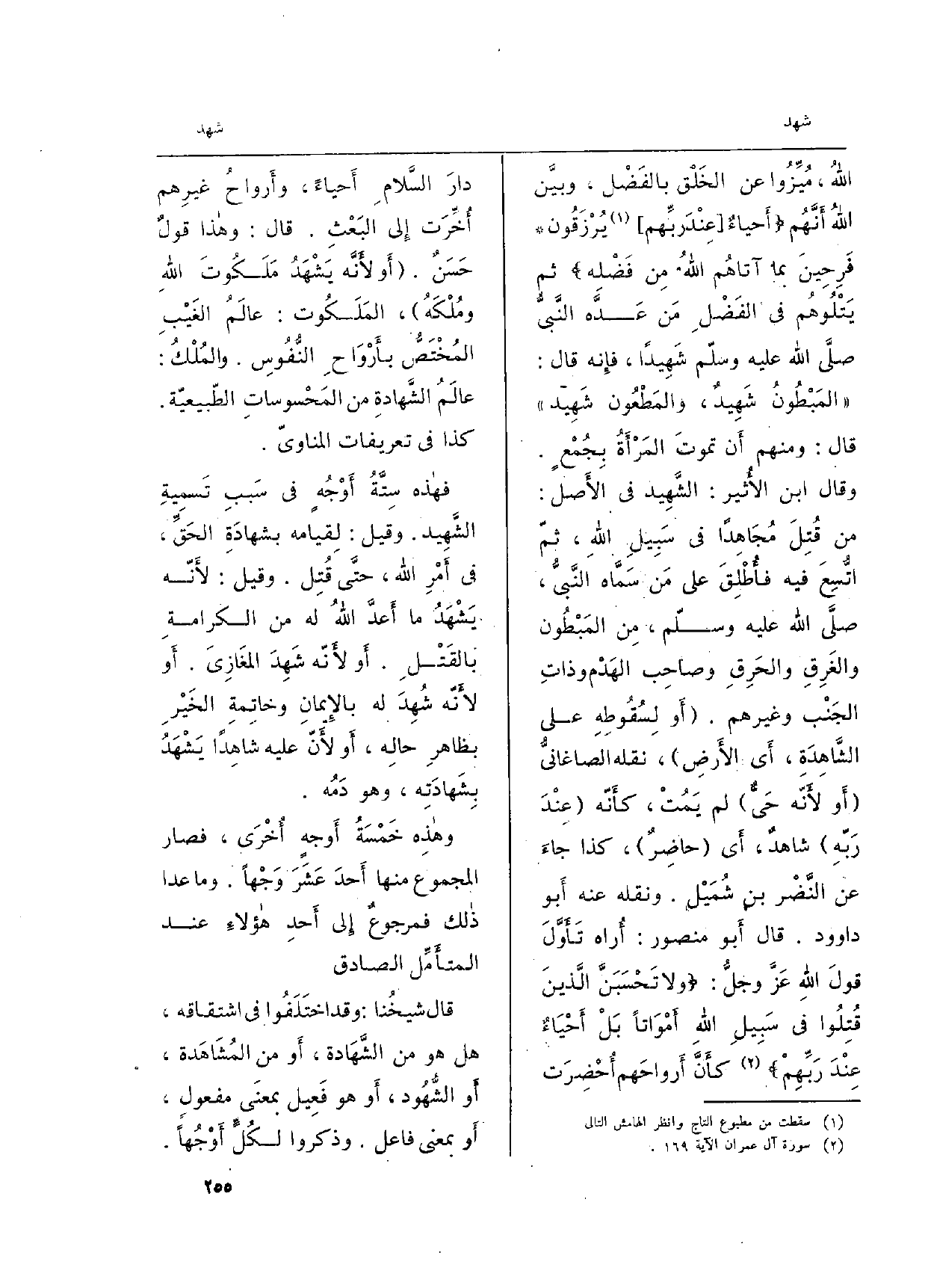 اللهُ، مُيِّزُوا عَن الخَلْق بالفَضْل، وبيَّن الله أَنَّهُم: {أَحْيَاء عِندَ رَبّهِمْ يُرْزَقُونَ} فَرِحِينَ بِمَآ ءاتَاهُمُ اللَّهُ مِن فَضْلِهِ (آل عمرَان: 169، 170) ثمَّ يتْلُوهُم فِي الفَضْلِ مَن عَدَّه النَّبيُّ صلَّى الله عليْه وسلّم شَهِيداً، فإِنه قَالَ: (المَبْطُونُ شَهِيدٌ، والمَطْعُون شَهِيد) قَالَ: وَمِنْهُم أَن تموتَ المَرْأَةُ بِجُمْعٍ. وَقَالَ ابْن الأُثير: الشَّهِيد فِي الأَصل: من قُتِلَ مُجَاهِداً فِي سَبِيلِ اللهِ، ثمّ اتُّسِعَ فِيهِ فأُطْلِقَ على مَن سَمَّاه النَّبيُّ، صلَّى الله عليْه وسلّم، مِن المَبْطُون والغَرِقِ والحَرِقِ وصاحِب الهَدْم وذاتِ الجَنْب وَغَيرهم. (أَو لِسُقُوطِهِ لى الشَّاهِدَةِ، أَي الأَرضِ) ، نَقله الصاغانيُّ (أَو لأَنّه حَيٌّ) لم يَمُتْ، كأَنه (عِندَ رَبّهِ) شاهدٌ، أَي (حاضِرٌ) ، كَذَا جاءَ عَن النَّضْر بن شُمَيْل. وَنَقله عَنهُ أَبو دَاوُود. قَالَ أَبو مَنْصُور: أُراه تَأَوَّلَ قولَ اللهِ عَزَّ وجلُّ: {وَلاَ تَحْسَبَنَّ الَّذِينَ قُتِلُواْ فِى سَبِيلِ اللَّهِ أَمْواتاً بَلْ أَحْيَاء عِندَ رَبّهِمْ} (آل عمرَان: 169) كأَنَّ أَرواحَهم أُحْضِرَت دارَ السَّلامِ أَحياءً، وأَرواحُ غيرِهم أُخِّرَت إِلَى البَعْثِ. قَالَ: وهاذا قولٌ حَسَنٌ. (أَو لأَنَّه يَشْهَدُ مَلَكُوتَ اللهِ ومُلْكَهُ) ، المَلَكُوت: عالَمُ الغَيْبِ المُخْتَصُّ بأَرْوَاحِ النُّفُوسِ. والمُلْكُ: عالَمُ الشَّهادةِ من المَحْسوساتِ الطّبيعيّة. كَذَا فِي تعريفات المناويّ.