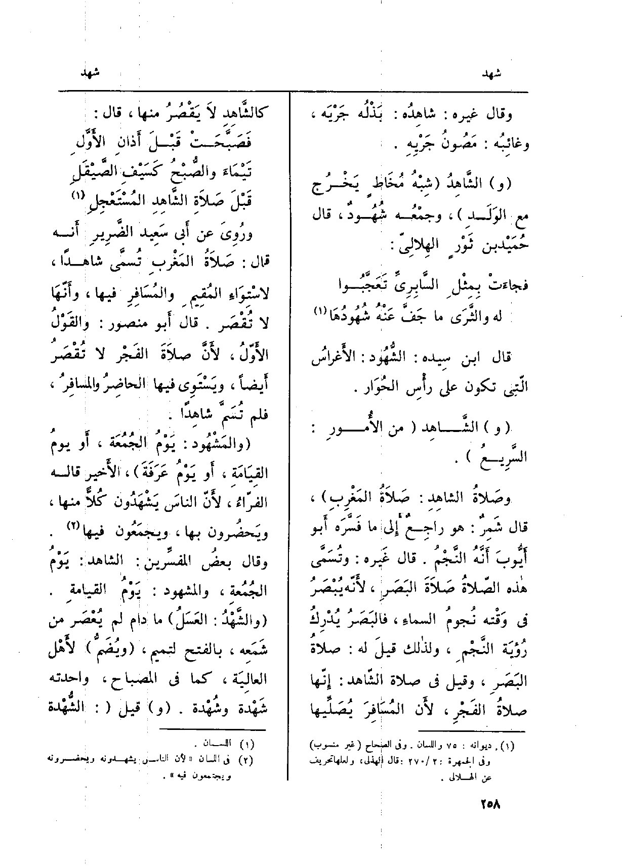 ورُوِيَ عَن أَبي سَعِيد الضَّرِيرِ أَنه قَالَ: صَلَاةُ المَغْربِ تُسمَّى شَاهدا، لاسْتِوَاءِ المُقِيمِ والمُسَافِرِ فِيهَا، وأَنّهَا لَا تُقْصَر. قَالَ أَبو مَنْصُور: والقَوْلُ الأَوّلُ، لأَنَّ صلَاةَ الفَجْر لَا تُقْصَرُ أَيضاً، ويَسْتَوِي فِيهَا الحاضِرُ والمسافِرُ، فَلم تُسَمِّ شاهِداً.