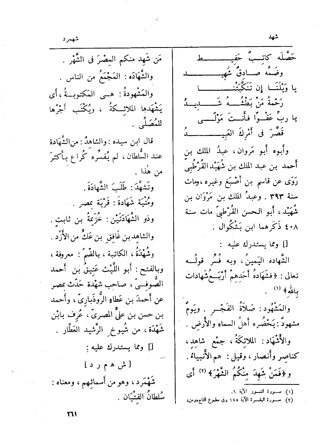 و: {فَمَن شَهِدَ مِنكُمُ الشَّهْرَ} (الْبَقَرَة: 185) أَي مَن شَهِد مِنْكُم المِصْرَ فِي الشَّهْر.