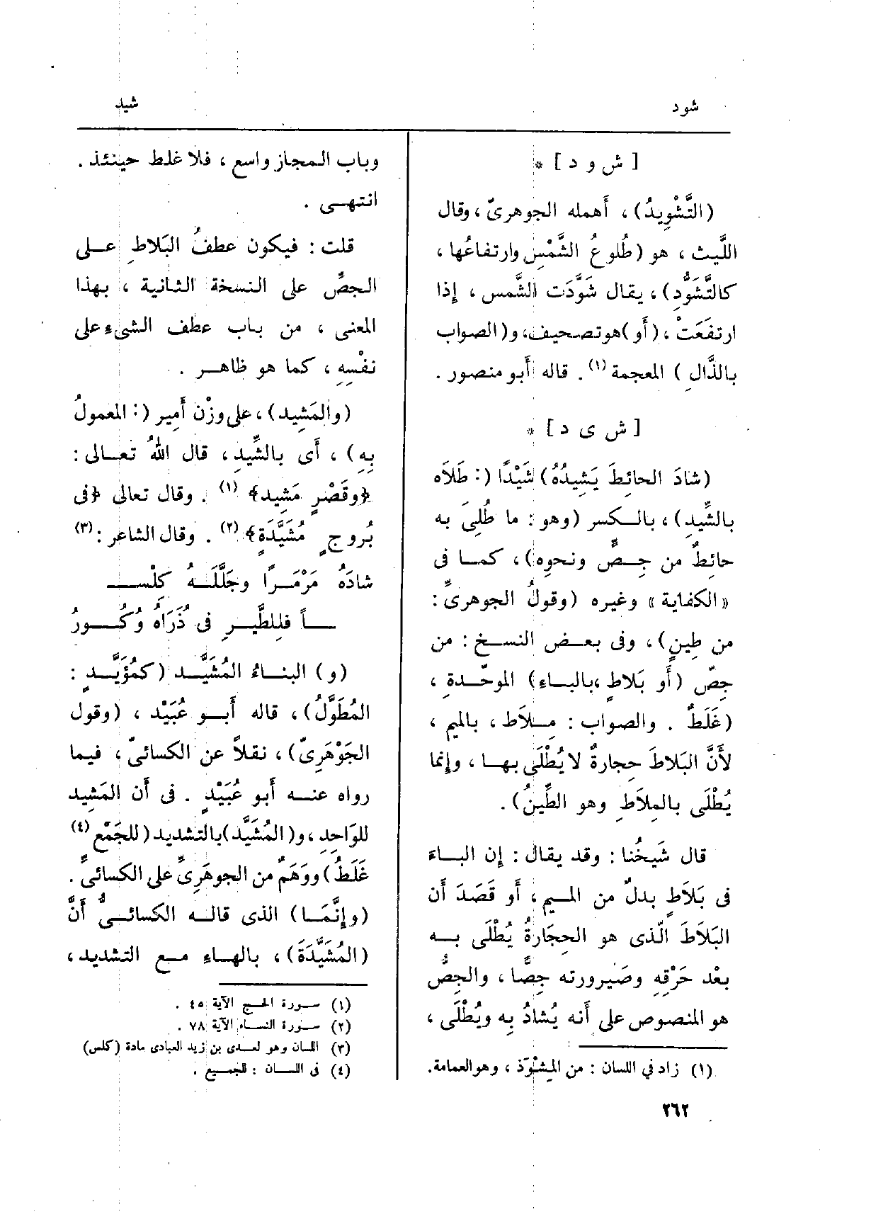 (و) البناءُ} المُشَيَّد (كمُؤَيَّدٍ: المُطَوَّلُ) ، قَالَه أَبو عُبَيْد، (وَقَول الجَوْهرِيّ) ، نقلا عَن الكسائيّ، فِيمَا رَوَاهُ عَنهُ أَبو عُبَيْدٍ. فِي أَن {المَشِيد للوَاحِدِ، و (} المُشَيَّد) بِالتَّشْدِيدِ (للجَمْع غَلَطُ) ووَهَمٌ من الجوهَرِيِّ على الكسائيِّ. (وإِنَّمَا) الَّذِي قَالَه الكسائيُّ أَنَّ (! المُشَيَّدَةَ) ، بالهاءِ مَعَ التَّشْدِيد،