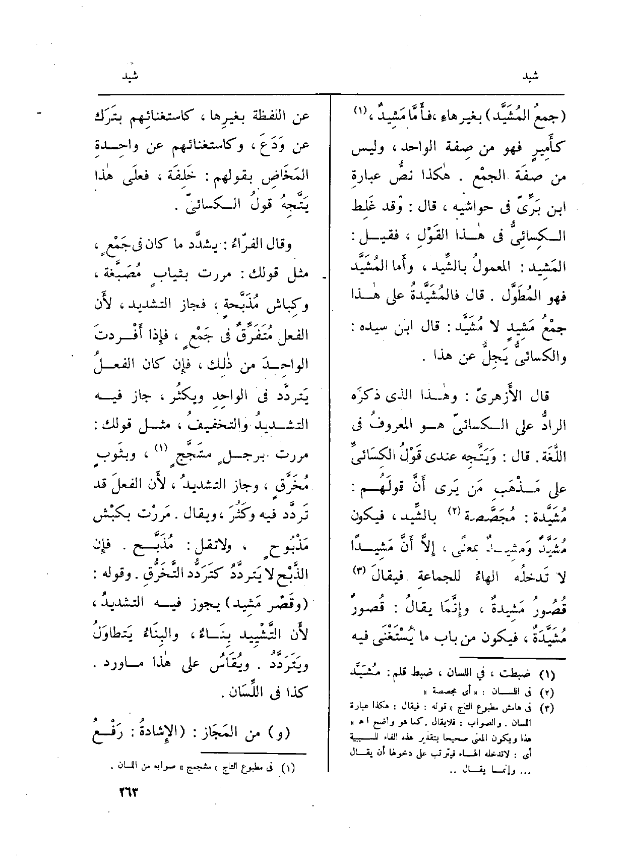 قَالَ الأَزهريّ: وهاذا الَّذِي ذكرَه الرادُّ على الكسائيّ هُوَ المعروفُ فِي اللُّغَة. قَالَ: وَيَتَّجِه عِنْدِي قَوْلُ الكِسَائيِّ على مَذْهَب مَن يَرى أَنَّ قولَهُم:} مُشَيدة: مُجَصَّصة {بالشِّيد، فَيكون} مُشَيَّدٌ {وَمشِيدٌ بِمَعْنى، إِلَّا أَنَّ} مَشِيداً لَا تَدخلُه الهاءُ للجماعةِ فيقالَ قُصُورُ {مَشِيدةٌ، وإِنَّمَا يقالُ: قُصورٌ} مُشَيَّدَةٌ، فَيكون من بَاب مَا يُسْتَغْنَى فِيهِ عَن اللَّفْظَة بغيرِها، كاستغنائِهم بتَرَك عَن وَدَعَ، وكاستغنائهم عَن واحِدةِ المَخَاضِ بقَوْلهمْ: خَلِفَة، فعلَى هاذا يَتَّجِهُ قولُ الكسائيّ.