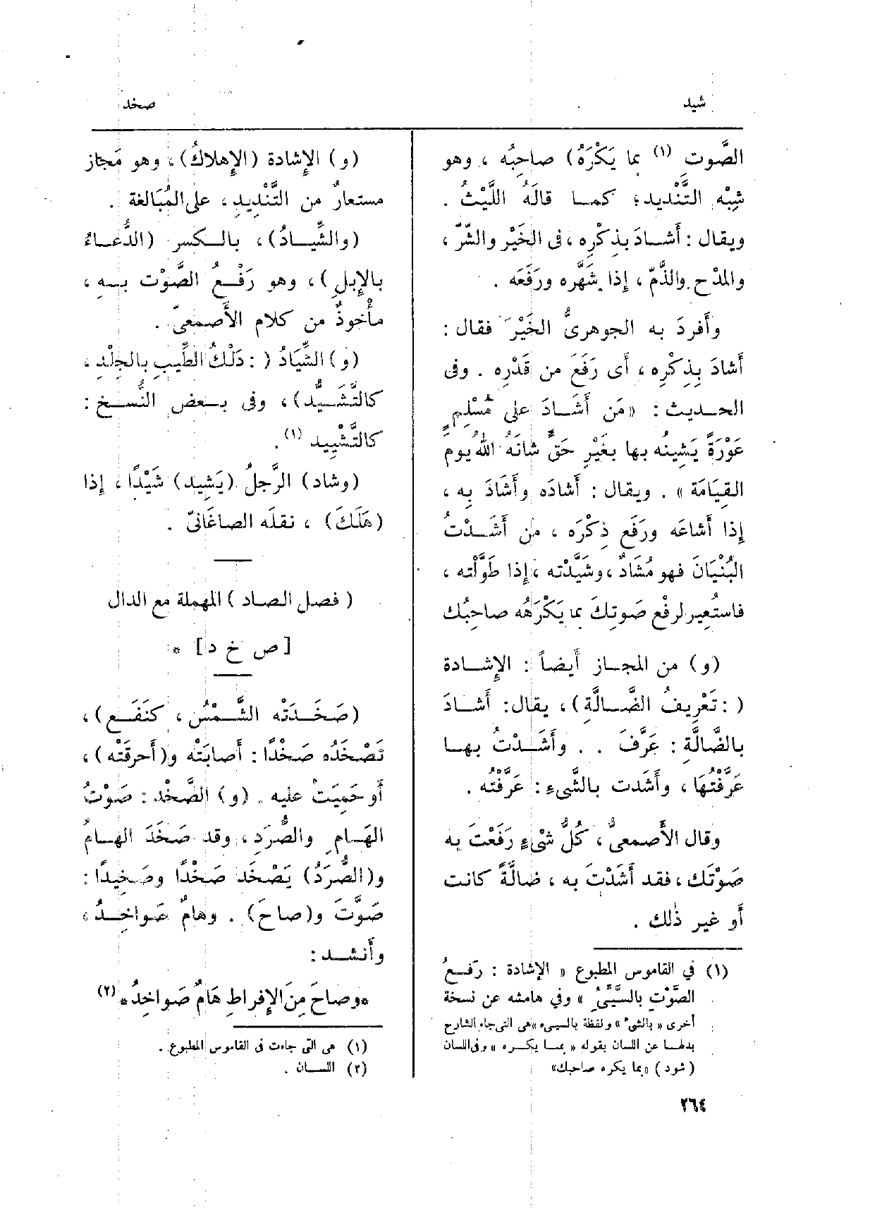 وَقَالَ الأَصمعيُّ، كُلُّ شيْءٍ رَفَعْتَ بِهِ صَوْتَك، فقد {أَشَدْتَ بِهِ، ضالَّةً كَانَت أَو غير ذالك (و) الإِشادة (الإِهلاكُ) ، وَهُوَ مَجاز مستعارٌ من التَّنْدِيدِ، على المُبَالغة.