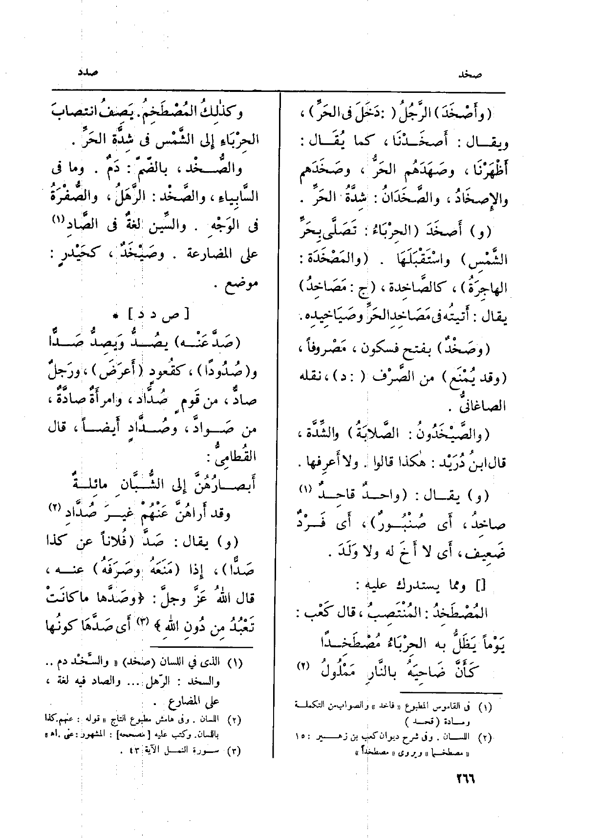 : ( {صَدّ َعَنْه) } يصُدُّ {ويَصِدُّ} صَدًّا و ( {صُدُوداً) ، كقُعودٍ (أَعرَضَ) ، ورَجلٌ} صادٌّ، من قومٍ {صُدَّاد، وامرأَةٌ} صادَّةٌ، من {صَوادَّ،} وصُدَّادٍ أَيضاً، قَالَ القُطامِيُّ: