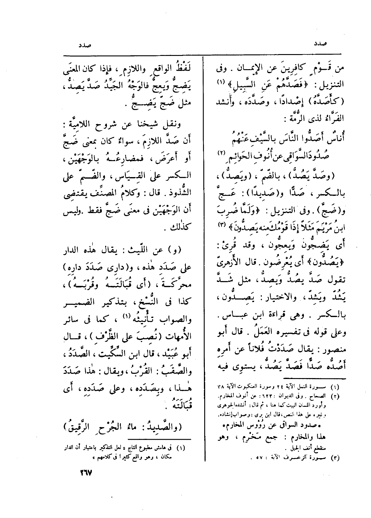 من قَوْمٍ كافِرِينَ عَن الإِيمان. وَفِي التَّنْزِيل: { {فَصَدَّهُمْ عَنِ السَّبِيلِ} (النَّمْل: 24) (} كأَصَدَّهُ) {إِصْداداً،} وصَدَّدَه، وأَنشد الفَرَّاءُ لذِي الرُّمَّة: