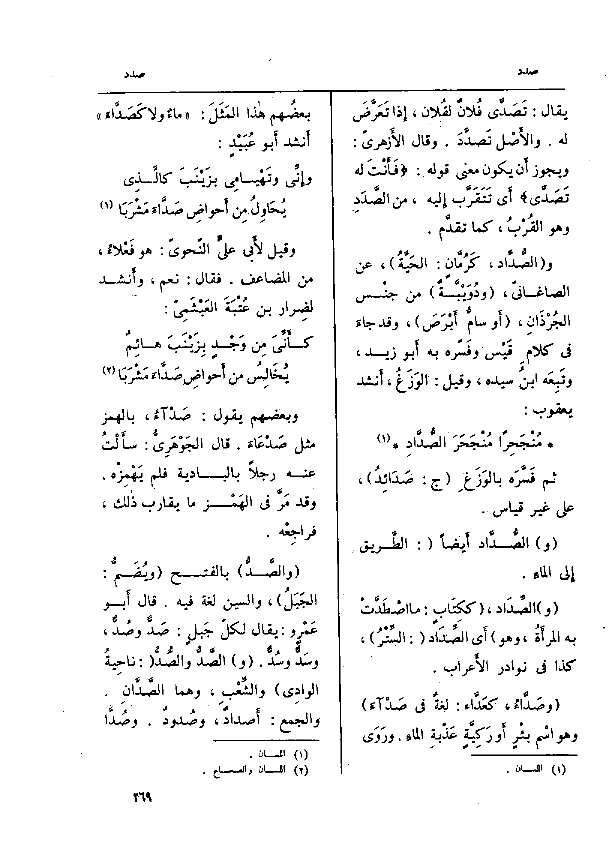 (} والصَّدُّ) بِالْفَتْح (ويُضَمُّ: الجَبَلُ) ، وَالسِّين لُغَة فِيهِ. قَالَ أَبو عَمْرٍ وَيُقَال لكلّ جَبلٍ: {صَدٌّ} وصُدٌّ، وسَدٌّ وسُدٌّ. (و) الصَّدُّ والصُّدُّ: (ناحِيةُ الوادِي) والشِّعْبِ، وهما {الصَّدَّان وَالْجمع:} أَصدادٌ، {وصُدودٌ.} وصُدَّا