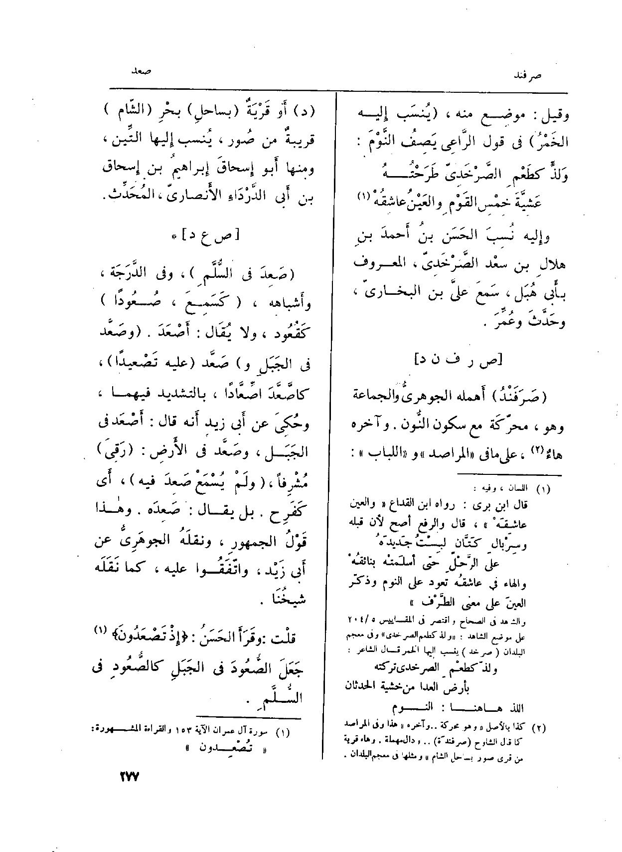 : (صَرَفَنْدُ) أَهمله الجوهريُّ وَالْجَمَاعَة وَهُوَ، محرّكَة مَعَ سُكُون النُّون. وَآخره هاءٌ، على مَا فِي (المراصد) و (اللّبَاب) : (د) أَو قَرْيَةٌ (بساحلِ) بحْرِ (الشّام) قريبةٌ من صُور، يُنسب إِليها التِّين، وَمِنْهَا أَبو إِسحاقَ إِبراهيمُ بن إِسحاق بن أبي الدَّرْدَاءِ الأَنصاريّ، المُحَدِّث.