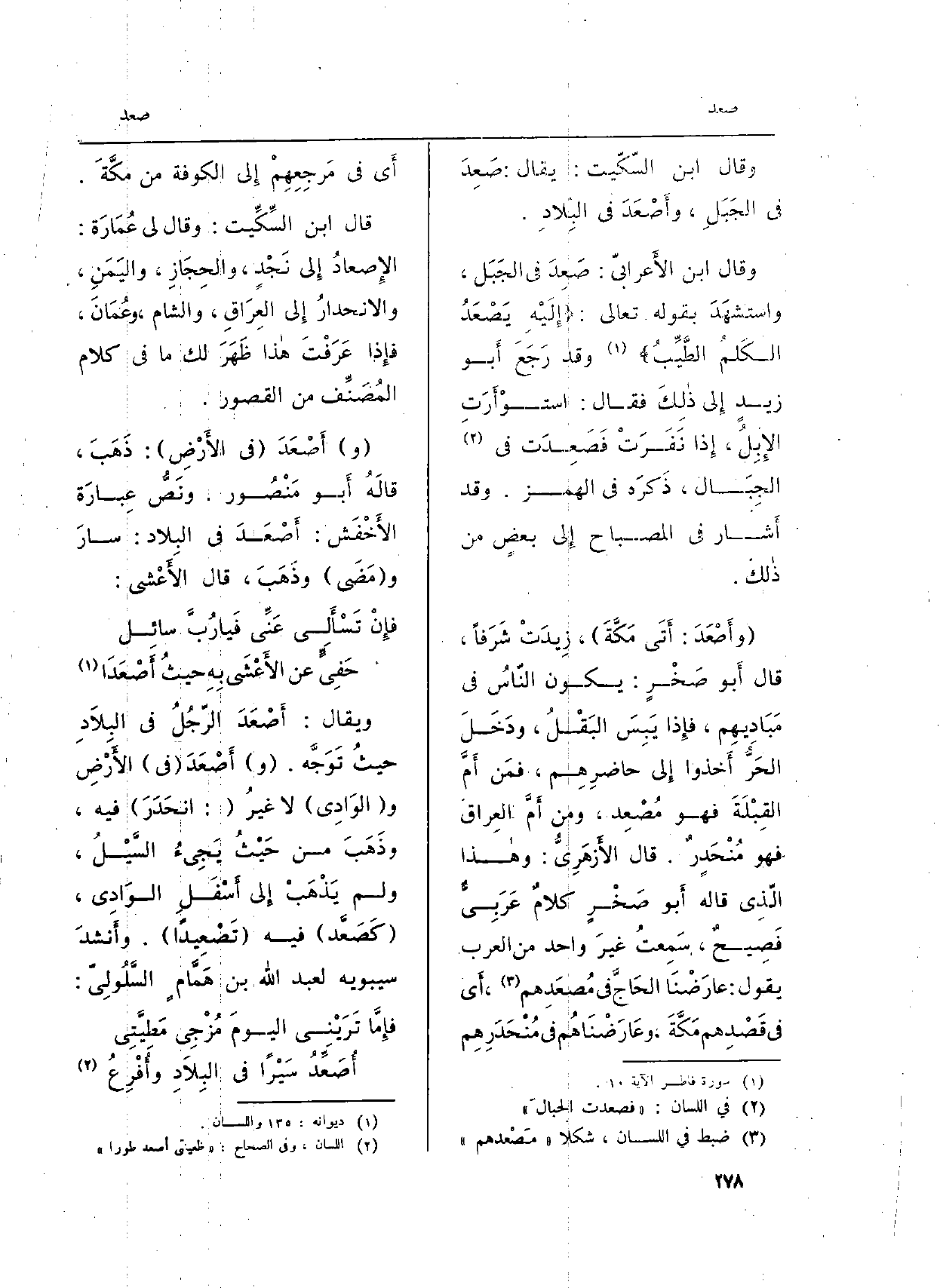 قَالَ ابْن السِّكِّيت: وَقَالَ لي عُمَارَة: الإِصعادُ إِلى نَجْدٍ، والحِجَازِ، واليَمَنِ، والانحدارُ إِلى العِرَاق، وَالشَّام، وعُمَانَ، فإِذا عَرَفْتَ هاذا ظَهَرَ لَك مَا فِي كَلَام المُصَنِّف من الْقُصُور.