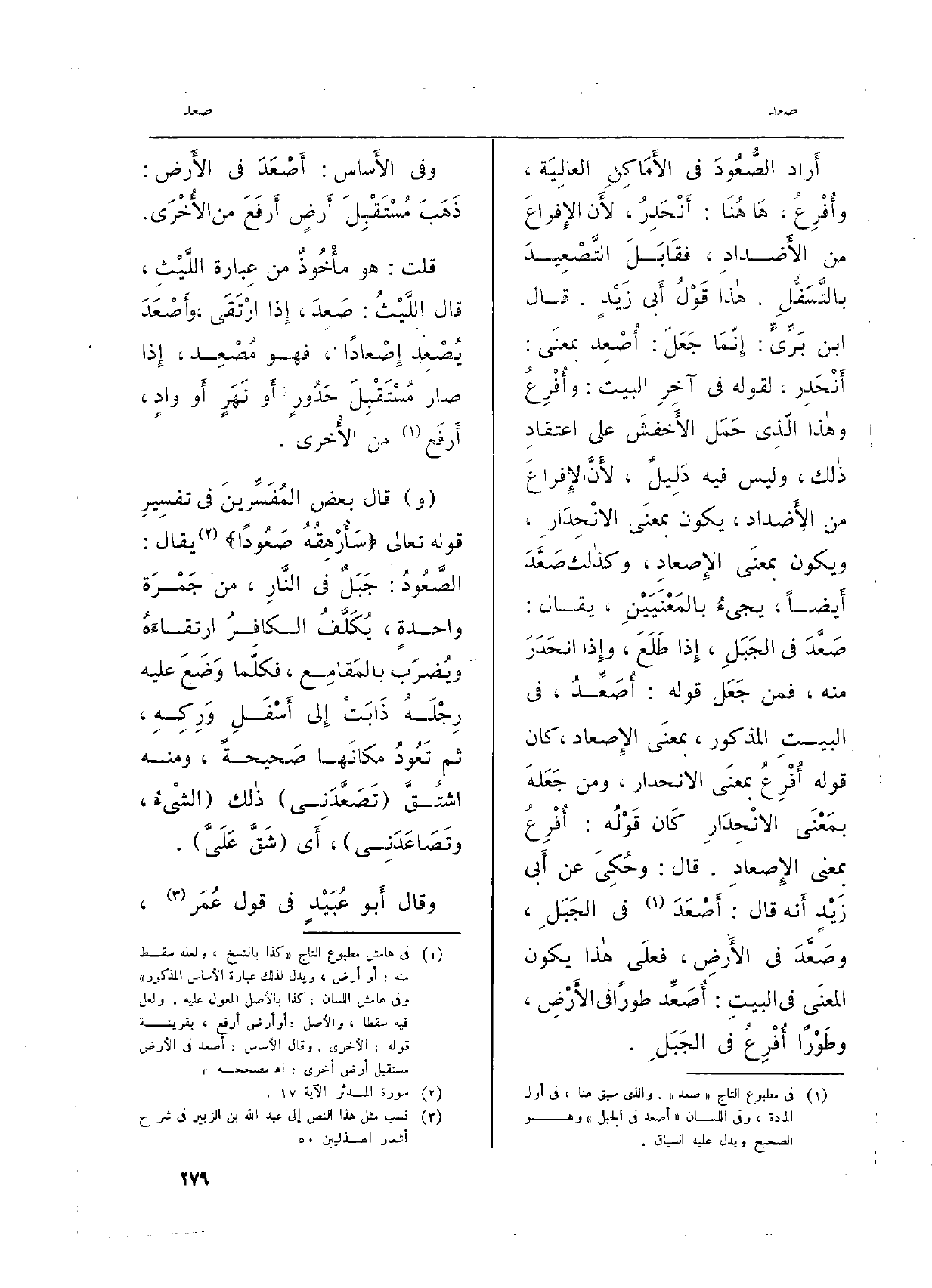 قلت: هُوَ مأْخُوذٌ من عِبارة اللَّيْثِ، قَالَ اللَّيْثُ: صَعِدَ، إِذا ارْتَقَى، وأَصْعَدَ يُصْعِد إِصْعاداً، فَهُوَ مُصْعِد، إِذا صَار مُسْتَقْبِلَ حَدُورٍ أَو نَهَرٍ أَو وادٍ، أَرفَع من الأُخرى.