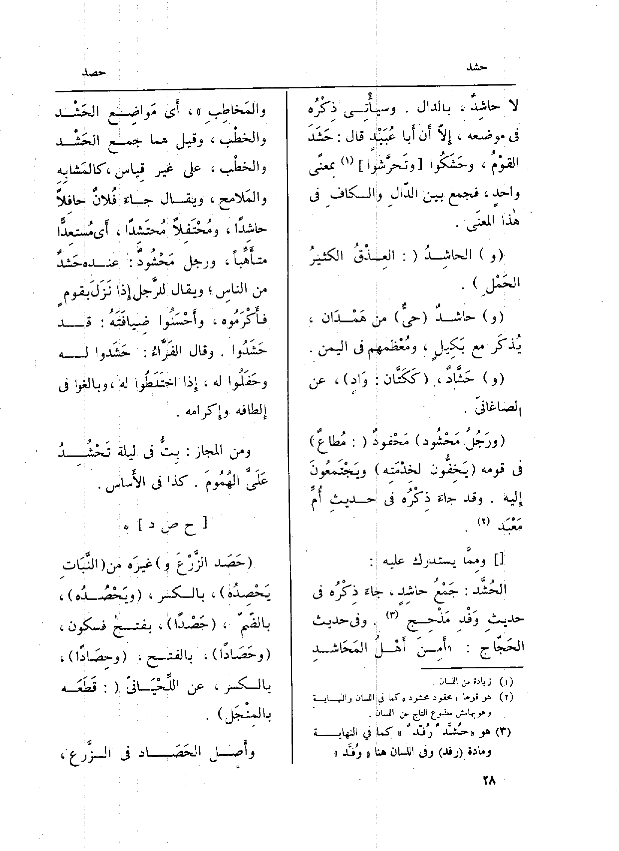 الحُشَّد: جَمْعُ حاشِدٍ، جاءَ ذِكْرُه فِي حديثِ وَفْدِ مَذْحِج. وَفِي حَدِيث الحَجّاج: (أَمِنَ أَهْلُ المَحَاشدِ والمَخاطِبِ) . أَي مَواضِع الحَشْد والخَطْب، وَقيل هما جمع الحَشْد والخطْب، على غير قِياس، كالمَشابِهِ والمَلامح، وَيُقَال جاءَ فُلانٌ حافِلاً حاشِداً، ومُحْتَفِلاً مُحتَشِداً، أَي مْستعِدًّا متأَهِّباً، وَرجل مَحْشُودً: عِنْده حَشدٌ من الناسِ؛ وَيُقَال للرَّجل إِذا نَزَلَ بقومٍ فأَكْرَمُوه، وأَحْسَنُوا ضِيافَتَهُ: قد حَشَدُوا. وَقَالَ الفَرَّاءُ: حَشَدوا لَهُ وحَفَلُوا لَهُ، إِذا اختَلَطُوا لَهُ، وبالغوا فِي إِلطافه وإِكرامه.