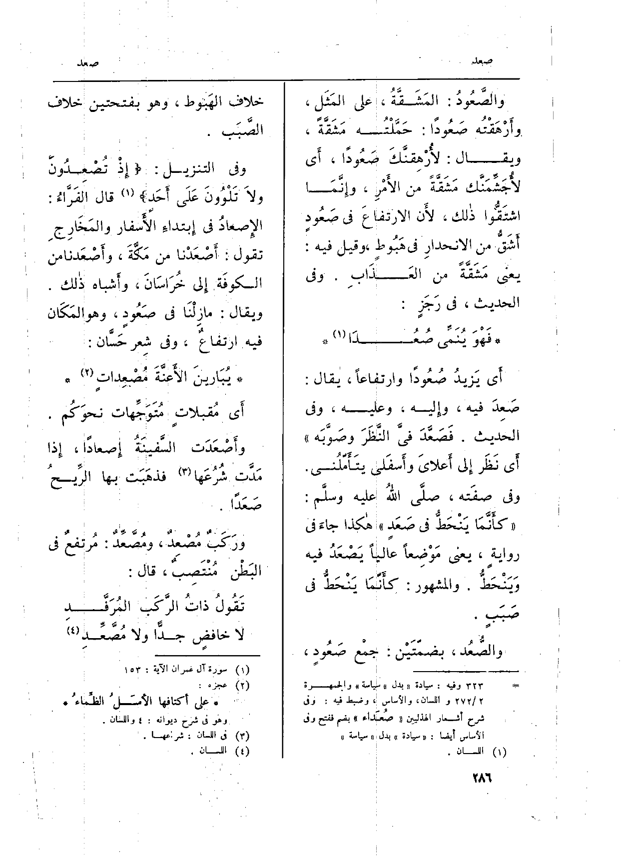 وَفِي التَّنْزِيل: {إِذْ تُصْعِدُونَ وَلاَ تَلْوُونَ عَلَى أحَدٍ} (آل عمرَان: 153) قَالَ الفَرَّاءُ: الإِصعادُ فِي إِبتداءِ الأَسفار والمَخَارِجِ تَقول: أَصْعَدْنا من مَكَّةَ، وأَصْعَدنا من الكوفَة إِلى خُرَاسَانَ، وأَشباه ذالك. وَيُقَال: مَا زِلنَا فِي صَعُودٍ، وَهُوَ المَكَان فِيهِ ارتفاعٌ، وَفِي شِعر حَسَّان: