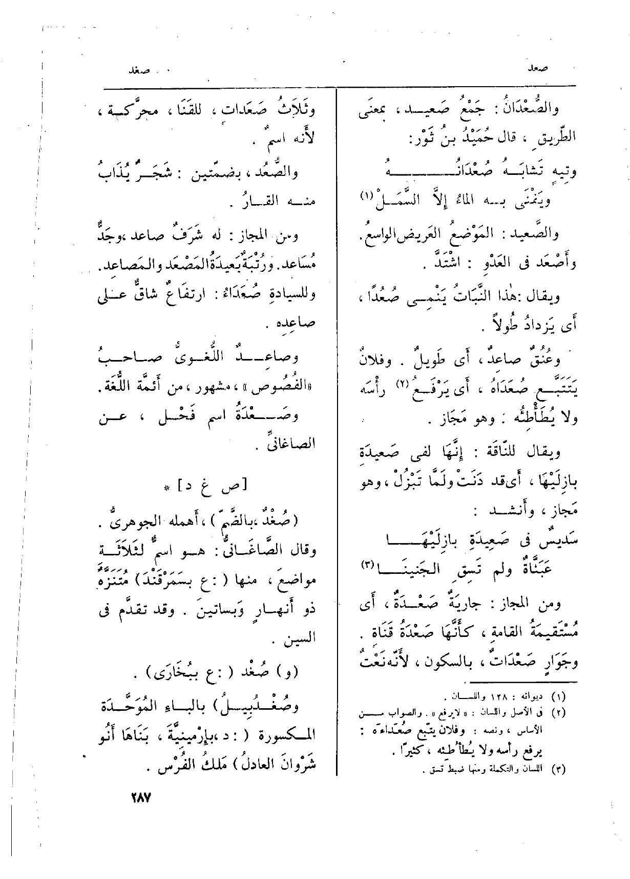 صغد: (صُغْدٌ، بالضَّمّ) ، أَهمله الجوهريُّ. وَقَالَ الصَّاغَانيُّ: هُوَ اسمٌّ لثَلَاثَةِ مواضعَ، مِنْهَا: (ع بسَمَرْقَنْدَ) مُتَنَزَّهٌ ذُو أَنهارٍ وَبساتينَ. وَقد تقدَّم فِي السِّين.