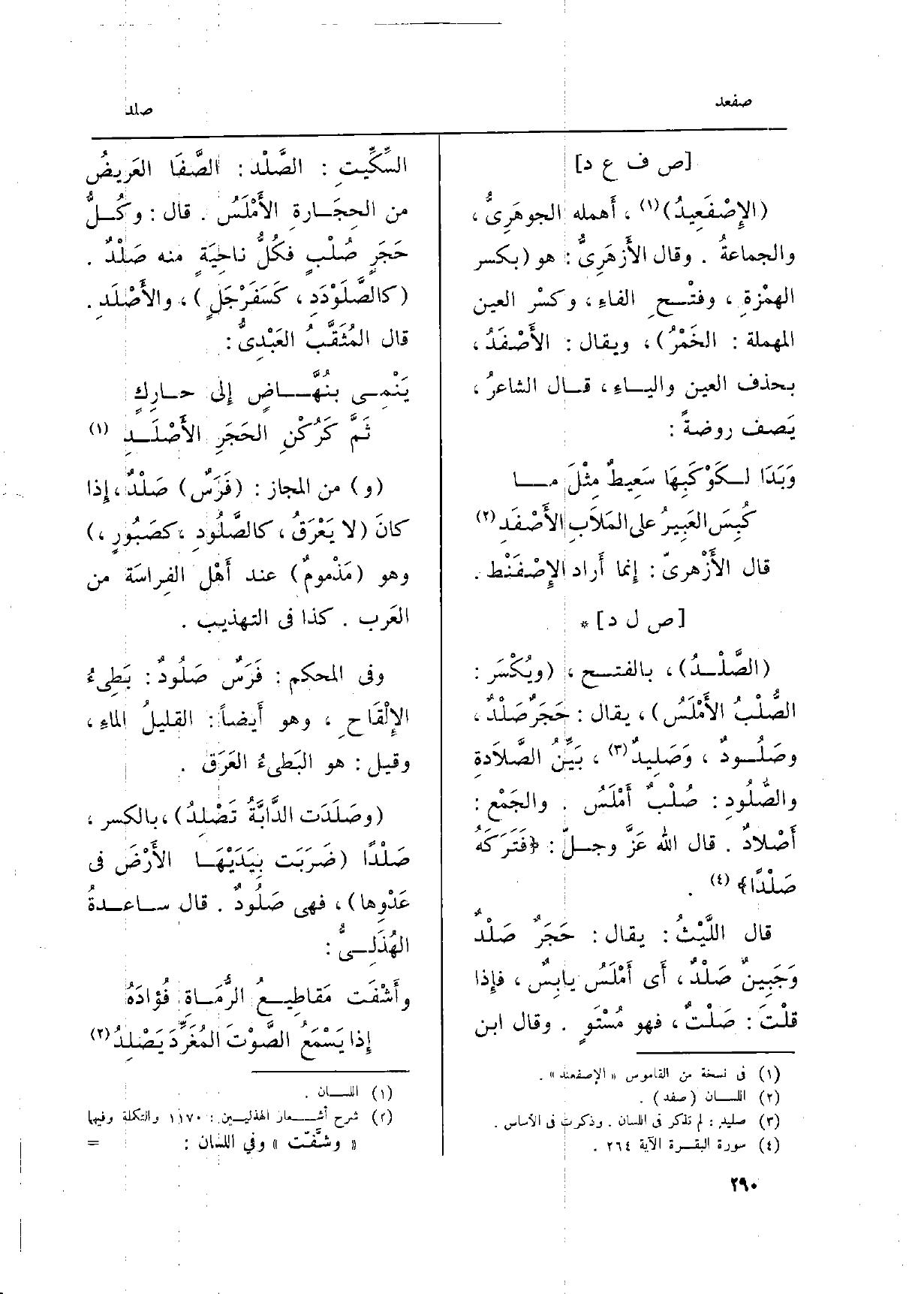 قَالَ اللَّيْثُ: يُقَال: حَجَرٌ صَلْدٌ وَجَبِينٌ صَلْدٌ، أَي أَمْلَسُ يابِسٌ، فإِذا قلْتَ: صَلْتٌ، فَهُوَ مُسْتَوٍ. وَقَالَ ابْن السِّكِّيتِ: الصَّلْد: الصَّفَا العَريضُ من الحِجَارةِ الأَمْلَسُ. قَالَ: وكُلُّ حَجَرٍ صُلْبٍ فكُلُّ ناحِيَةٍ مِنْهُ صَلْدٌ. (كالصَّلَوْدَدِ، كَسَفَرْجَلٍ) ، والأَصْلَدِ. قَالَ المُثَقَّبُ العَبْدِيُّ:
