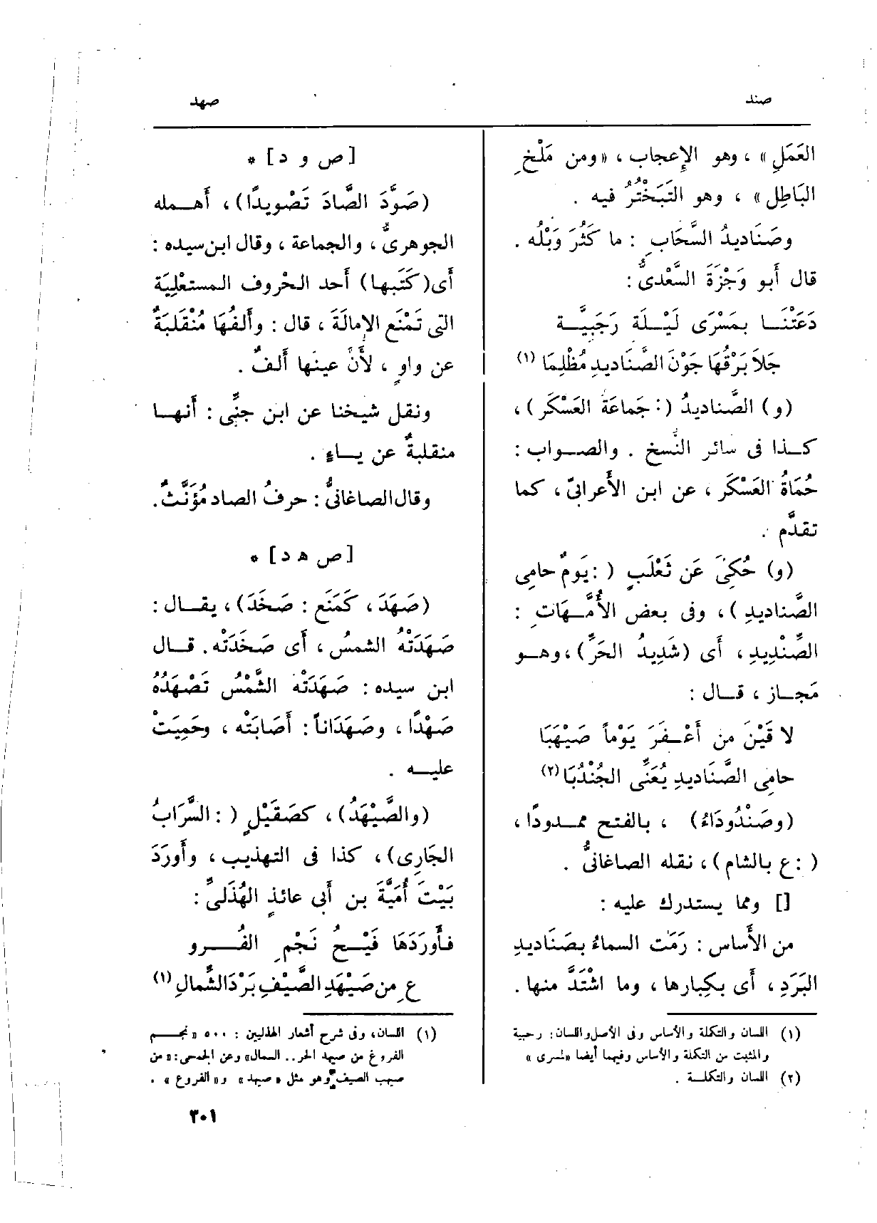 (و) الصَّناديدُ: (جَماعَة العَسْكَر) ، كَذَا فِي سَائِر النُّسخ. وَالصَّوَاب: حُمَاةُ العَسْكَر، عَن ابْن الأَعربيّ، كم تقدَّم.
