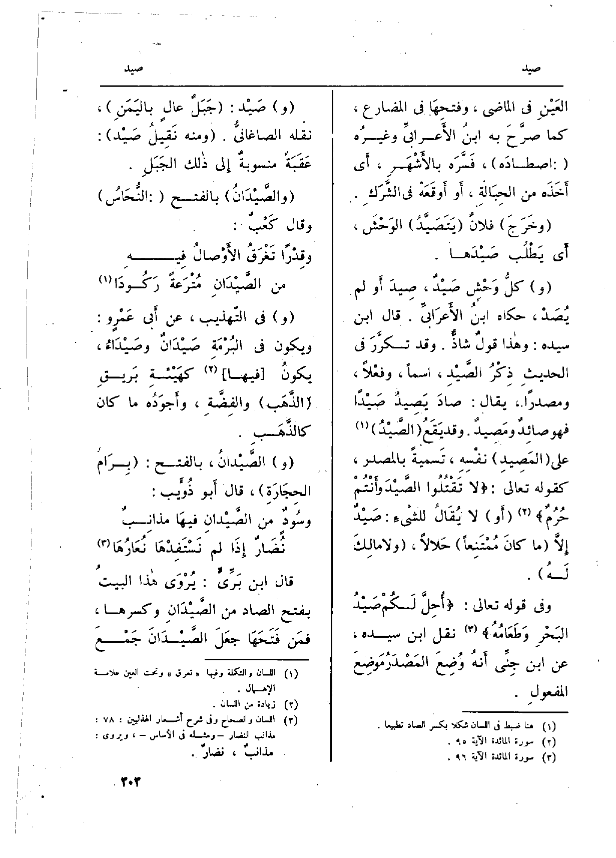 (و) كلُّ وَحْشٍ} صَيْدٌ، {صِيدَ أَو لم} يُصَدْ، حَكَاهُ ابنُ الاعرَابيِّ. قَالَ ابْن سَيّده: وهاذا قولٌ شاذٌّ. وَقد تركَّرَ فِي الحديثِ ذِكْرُ {الصَّيْدِ، إسماً، وفعْلاً، ومصدراً، يُقَال:} صادَ {يَصِيدُ} صَيْداً فَهُوَ {صائِدٌ} ومَصِيدٌ. وَقد يَقَعُ (الصَّيْدُ) على ( {المَصِيدِ) نفْسِهِ، تَسميةً بِالْمَصْدَرِ، كَقَوْلِه تَعَالَى: {لاَ تَقْتُلُواْ الصَّيْدَ وَأَنْتُمْ حُرُمٌ} (الْمَائِدَة: 95) (أَو) لَا يُقَالُ للشيْءِ: صَيْدٌ إِلَّا (مَا كانَ مُمْتَنِعاً) حَلالاً، (وَلَا مالِكَ لَهُ) .