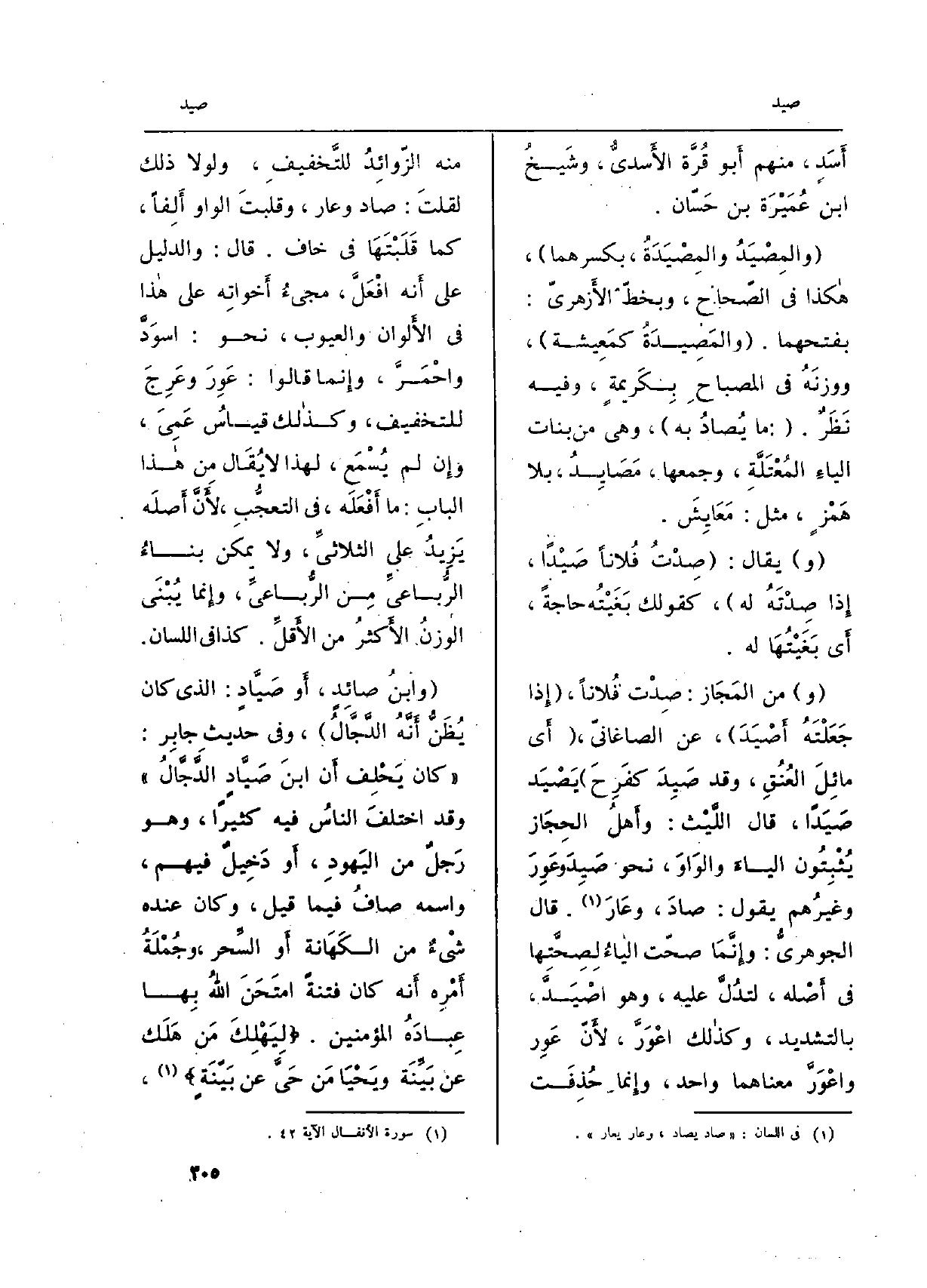 (وابنُ} صائِدٍ، أَو! صَيَّادٍ: الَّذِي كَانَ يُظَنُّ أَنَّهُ الدَّجَّالُ) ، وَفِي حَدِيث جابِر: (كَانَ يَحْلِف أَن ابنَ صَيَّادٍ الدَّجَّالُ) وَقد اختلفَ الناسُ فِيهِ كثيرا، وَهُوَ رَجلٌ من اليَهودِ، أَو دَخِيلٌ فيهم، واسْمه صافُ فِيمَا قيل، وَكَانَ عِنْده شيْءٌ من الكَهَانة أَو السِّحر، وجُمْلَةُ أَمْرِه أَنه كَانَ فتْنَة امتَحن اللهُ بِها عِبادَهُ الْمُؤمنِينَ. {مَنْ هَلَكَ عَن بَيّنَةٍ وَيَحْيَى مَنْ حَىَّ عَن بَيّنَةٍ وَإِنَّ} (الْأَنْفَال: 42)
