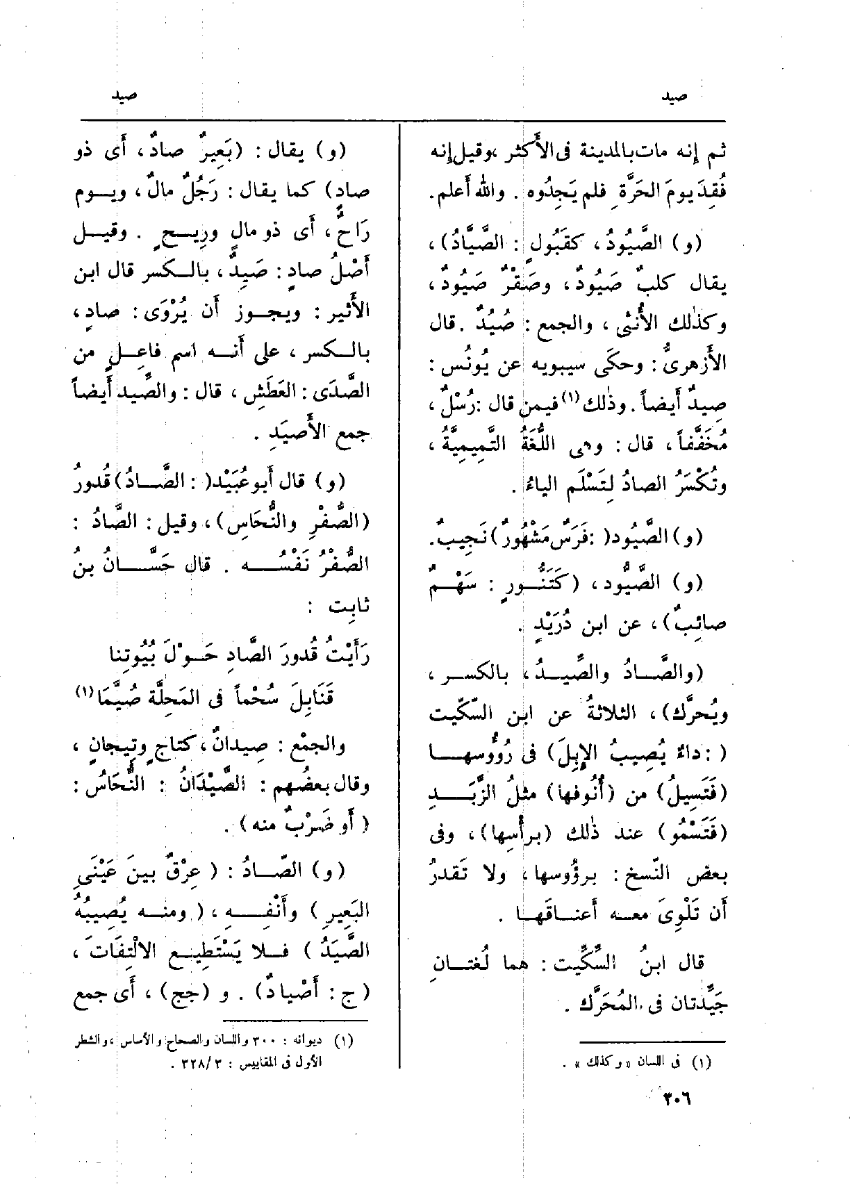 (و) {الصَّيُودُ، كقَبُولٍ:} الصَّيَّادُ) ، يُقَال كلبٌ {صَيُودٌ، وصَقْرٌ صَيُودٌ، وكذالك الأُنثى، وَالْجمع:} صُيُدٌ. قَالَ الأَزهريُّ: وحكَى سِيبَوَيْهٍ عَن يُونُس: {صِيدٌ أَيضاً. وذالك فِيمَن قَالَ: رُسْلٌ، مُخَفَّفاً، قَالَ: وَهِي اللُّغَةُ التَّمِيمِيَّةُ، وتُكْسَرُ الصادُ لِتَسْلَم الياءُ.
