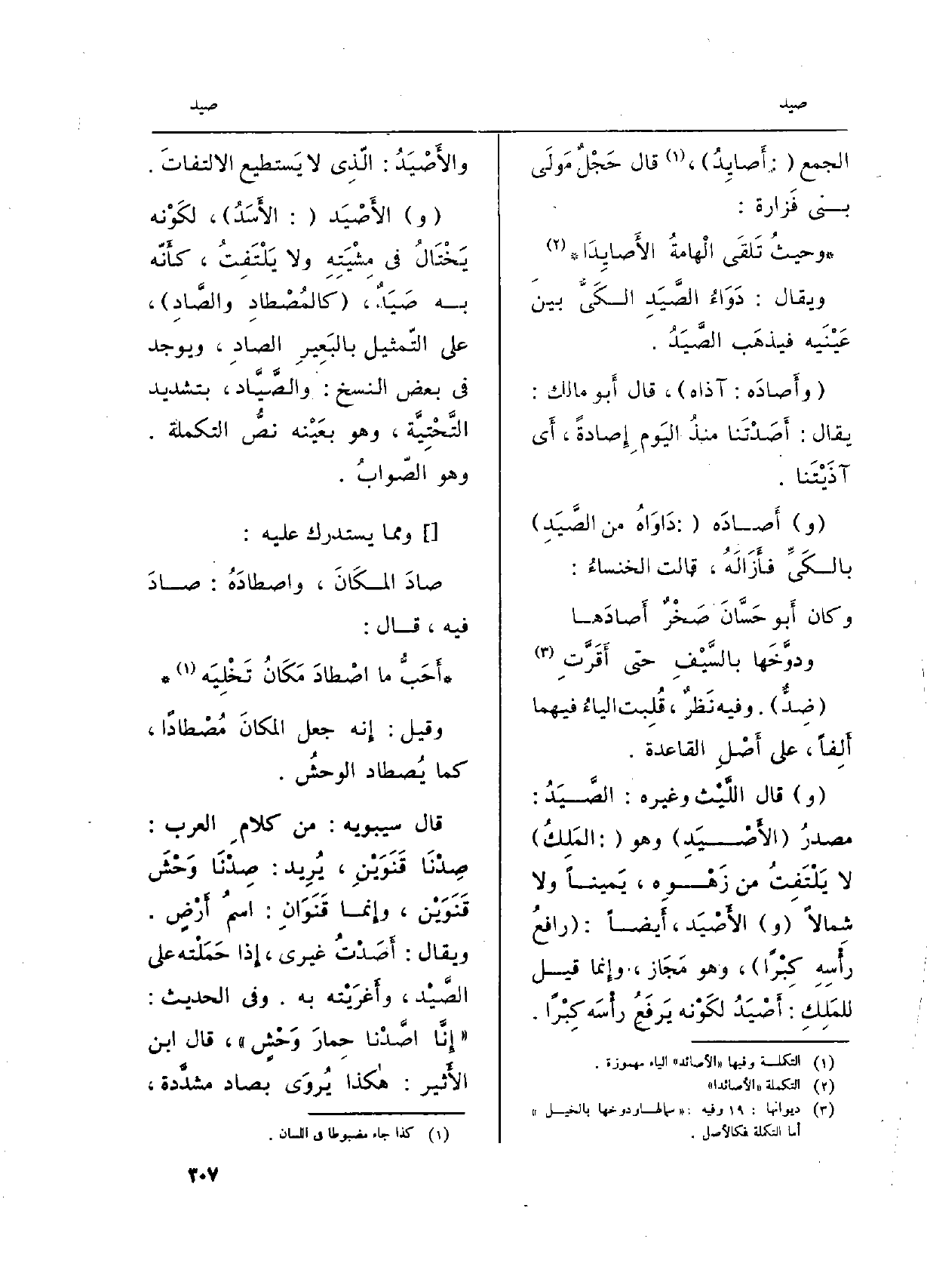 قَالَ سِيبَوَيْهٍ: من كلامِ الْعَرَب:} صِدْنَا قَنَوَيْنِ، يُرِيد: صِدْنَا وَحْشَ قَنَوَيْن، وإِنما قَنَوَانِ: اسمُ أَرْضٍ. وَيُقَال: {أَصَدْتُ غَيْرِي، إِذا حَمَلْته على الصَّيْد، وأَغرَيْته بِهِ. وَفِي الحَدِيث: (إِنَّا} اصَّدْنا حِمارَ وَحْشٍ) ، قَالَ ابْن الأَثير: هاكذا يُروَى بصاد مشدَّدة،
