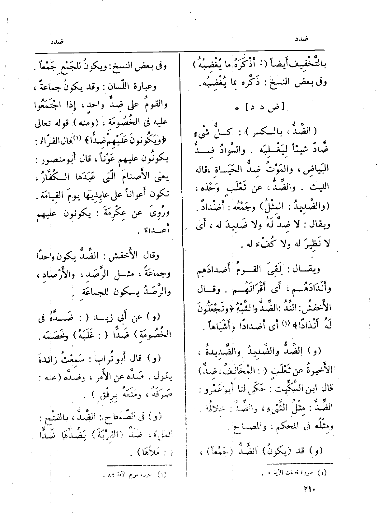 وَعبارَة اللّسان: وَقد يكونُ جمَاعَة، والقومُ على} ضِدّ واحدٍ، إِذ اجْتَمَعُوا عَلَيْهِ فِي الخُصُومَةِ، (وَمِنْه) قَوْله تَعَالَى: {وَيَكُونُونَ عَلَيْهِمْ {ضِدّاً} (مَرْيَم: 82) قَالَ الفرّاءُ: يكونُون عَلَيْهِم عَوْناً، قَالَ أَبو مَنْصُور: يَعْنِي الأَصنامَ الّتي عَبَدَها الكُفَّارُ، تكون أَعواناً على عابِدِيها يومَ القِيامَة. ورُوِيَ عَن عِكْرِمَةَ: يكونُونَ عَلَيْهِم أَعدَاء.