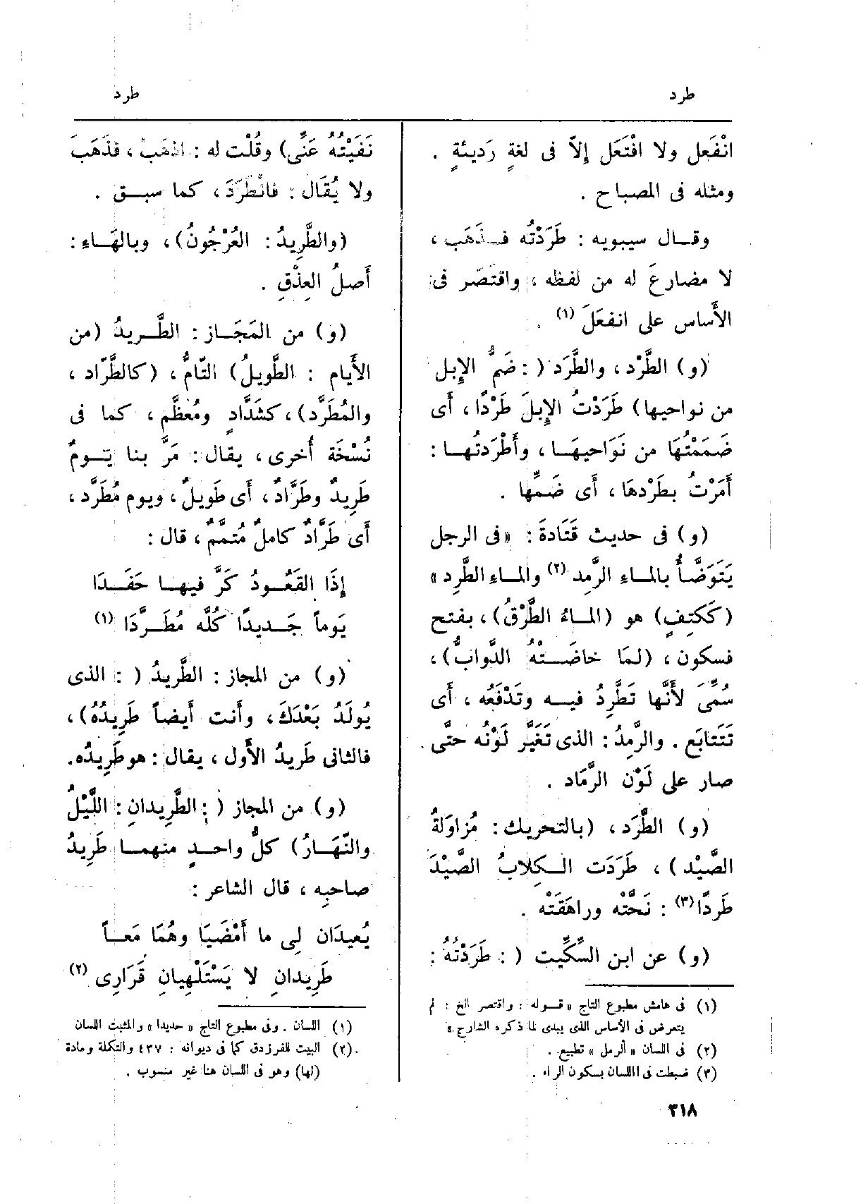 (و) مِنَ المَجَازِ: الطَّريدُ (من الأَيام الطَّويلُ) التّامُّ، (كالطَّرّاد، والمُطَرَّد) ، كشَدَّادٍ ومُعظَّم، كَمَا فِي نُسْخَة أُخرى، يُقَال: مَرَّ بِنَا يومٌ طَرِيدٌ وطَرَّادٌ، أَي طَوِيلٌ، وَيَوْم مُطَرَّد، أَي طَرَّادٌ كالمٌ مُتمَّمٌ، قَالَ: