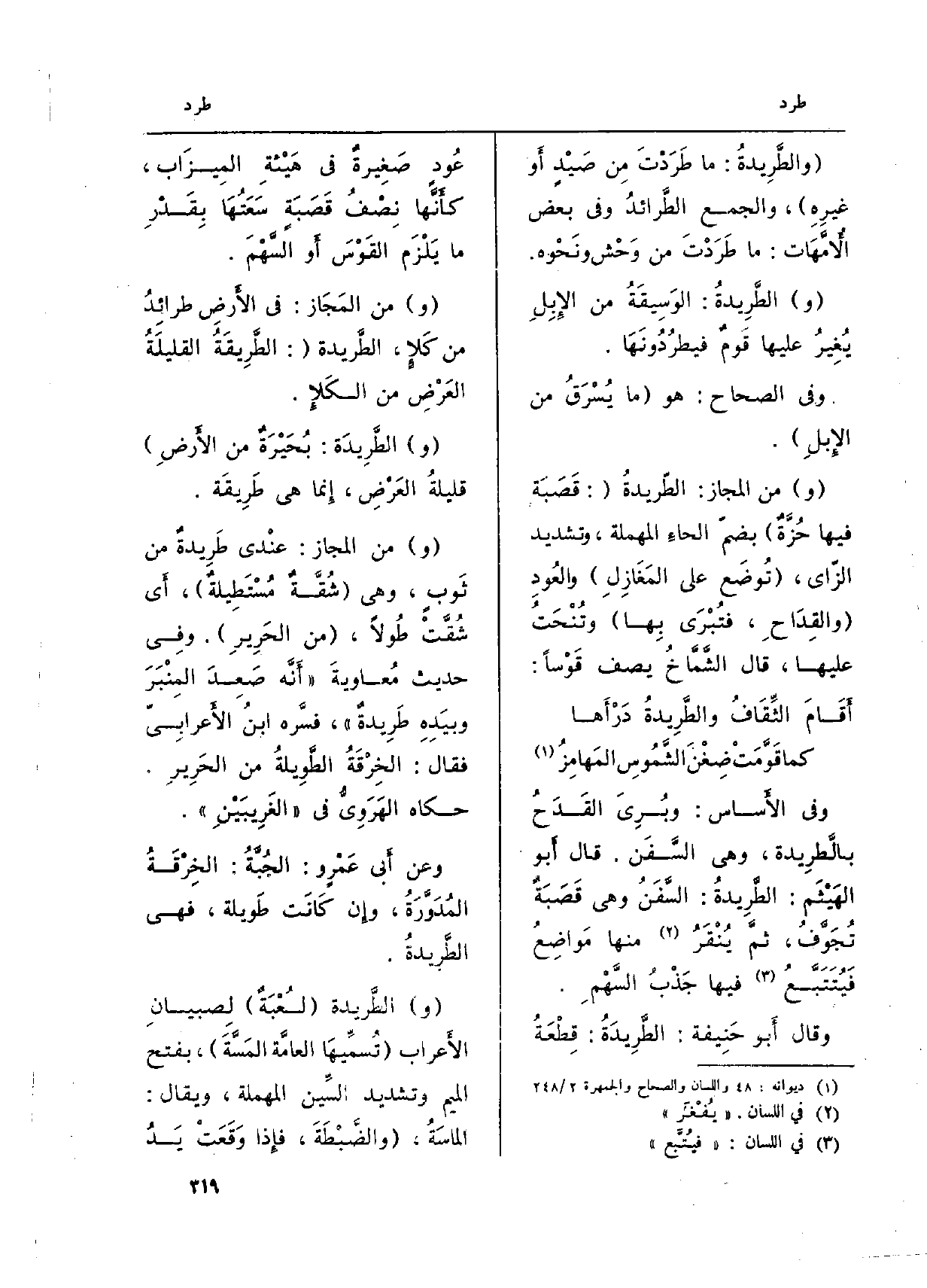 (و) من الْمجَاز: الطّريدةُ: (قَصَبَة فِيهَا حُزَّةٌ) بضمّ الحاءِ الْمُهْملَة، وَتَشْديد الزّاي، (تُوضَع على المَغَازِلِ) والعُودِ (والقِدَاحِ، فتُبْرَى بِها) وتُنْحَتُ عَلَيْهَا، قَالَ الشَّمَّاخُ يصف قَوْساً:
