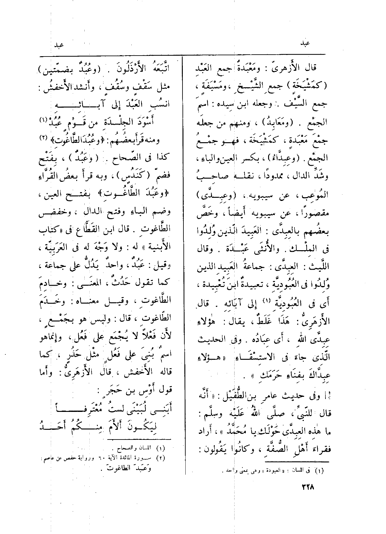 وَمِنْه قَرأَ بعضُهُم: {وَعَبَدَ الطَّاغُوتَ} (الْمَائِدَة: 60) كَذَا فِي الصّحاح. (وعَبُدٌ) ، بِفَتْح فضمّ (كَنَدُسٍ) ، وَبِه قرأَ بعضُ القُرَّاءِ {وَعَبَدَ الطَّاغُوتَ} بِفَتْح الْعين، وَضم الباءِ وَفتح الدَّال، وخفض الطاغوتِ. قَالَ ابْن القَطَّاع فِي (كتاب الأَبنية) لَهُ: وَلَا وَجْه لَهُ فِي العَرَبِيّة، وَقيل: عَبُدٌ، واحدٌ يَدُلُّ على جمَاعَة، كَمَا تَقول حَدُثٌ، المعنَى: وخاِمَ الطَّاغَوتِ، وَقيل مَعْنَاهُ: وخَدَمَ الطّاغوتِ، قَالَ: وَلَيْسَ هُوَ بجَمْعٍ، لأَن فَعْلاً لَا يُجْمَع على فَعُل، وإِنما هُوَ اسمٌ بُنِيَ على فَعْلٍ مثْل حَذُرٍ، كَمَا قَالَه الأَخفش، قَالَ لأَزهَرِيُّ: وأَما قَول أَوْسِ بن حَجَرٍ: