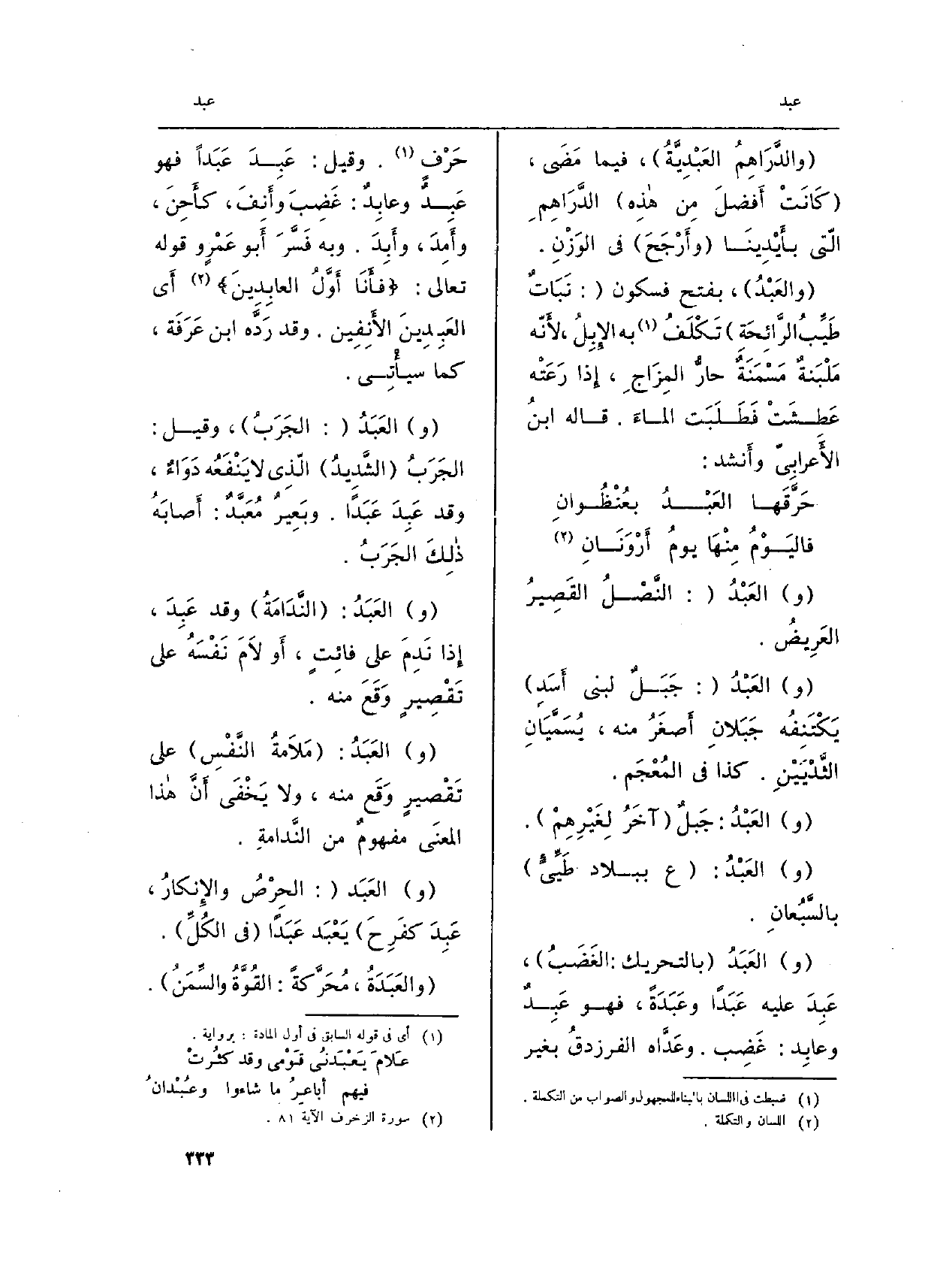 (و) العَبَدُ (بِالتَّحْرِيكِ: الغَضَبُ) ، عَبِدَ عَلَيْهِ عَبَداً وعَبَدَةً، فَهُوَ عَبِدٌ وعابِد: غَضِب. وعَدَّاه الفرزدقُ بِغَيْر حَرْفٍ. وَقيل: عَبِدَ عَبَداً فَهُوَ عَبِدٌ وعابِدٌ: غَضِبَ وأَنِفَ، كأَحِنَ، وأَمِدَ، وأَبِدَ. وَبِه فَسَّرَ أَبو عَمْرٍ وَقَوله تَعَالَى: {فَأَنَاْ أَوَّلُ الْعَابِدِينَ} (الزخرف: 81) أَي العَبِدِينَ الأَنِفِين. وَقد رَدَّه ابْن عَرَفَة، كَمَا سيأْتِي.