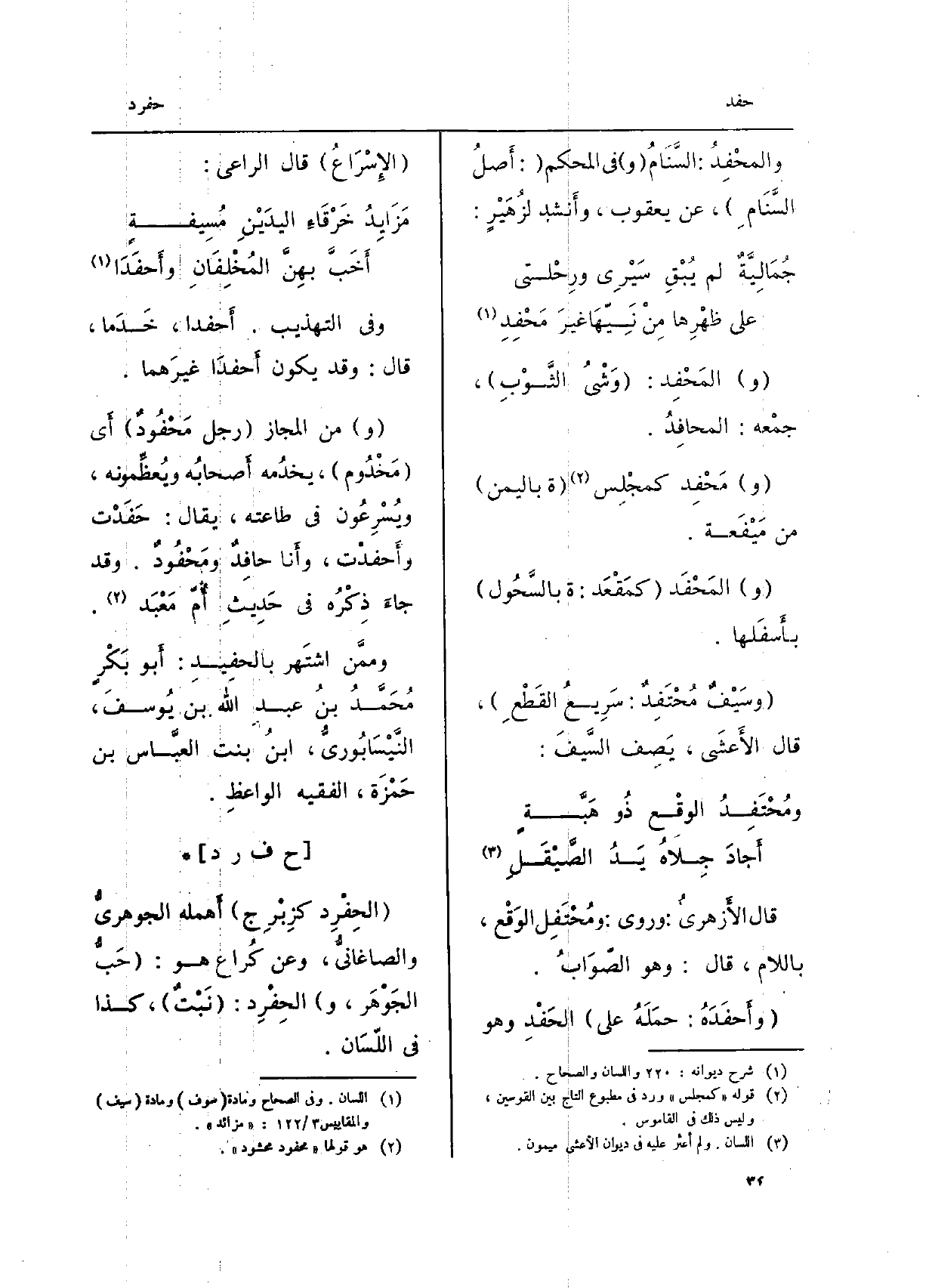 (وسَيْفٌ مُحْتَفِدٌ: سَرِيعُ القَطْعِ) ، قَالَ الأَعشَى، يَصِف السَّيفَ: