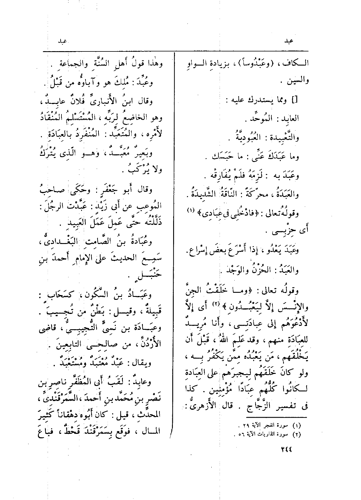 وقولُه تَعَالَى: {وَمَا خَلَقْتُ الْجِنَّ وَالإِنسَ إِلاَّ لِيَعْبُدُونِ} (الذاريات: 56) أَي إِلَّا لأَدْعُوَهُم إِلى عِبادَتِي، وأَنا مُرِيدٌ للعِبَادَةِ مِنْهُم، وَقد عَلِمَ اللهُ، قَبْلَ أَن يَخْلُقَهم، مَن يَعْبُدُه مِمَّن يَكْفُرُ بِه، وَلَو كانَ خَلَقَهُم لِيجبرَهم على العِبَادةِ لكانُوا كُلُّهُم عِبَاداً مُؤْمِنِين. كَذَا فِي تَفْسِير الزَّجَّاج. قَالَ الأَزهريُّ: وهاذا قولُ أَهلِ السُنَّةِ والجماعةِ.