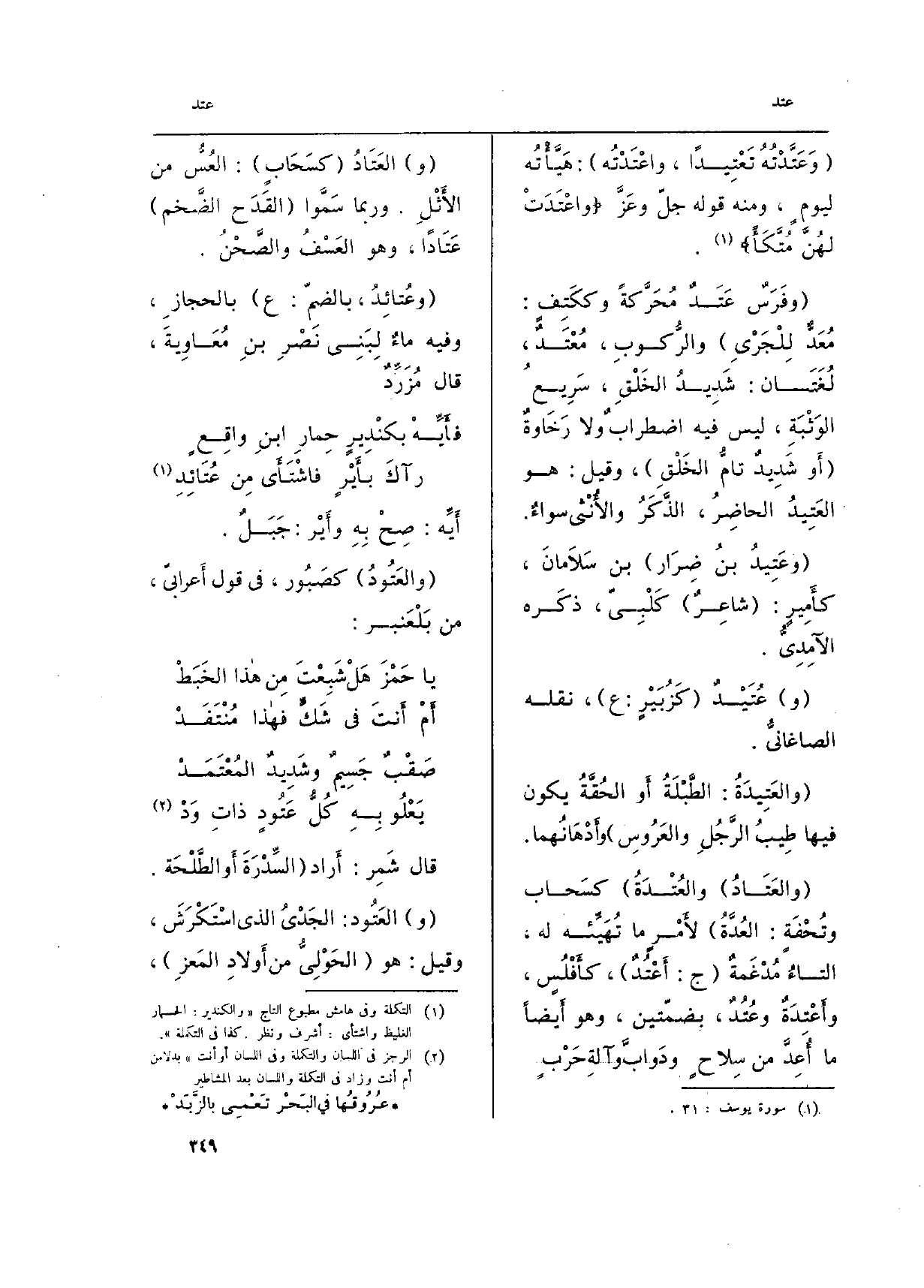 (وعَتَّدْتِ تَعْتِيداً، واعْتَدْتُه) : هَيَّأْتُه ليومٍ، وَمِنْه قَوْله جلّ وعَزَّ: {وَأَعْتَدَتْ لَهُنَّ مُتَّكَئًا} (يُوسُف: 31) .