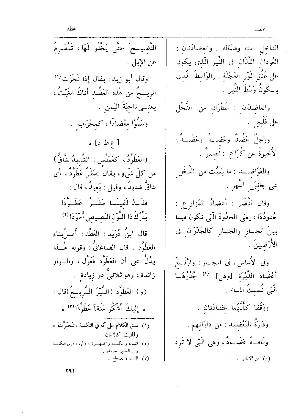 ودَارَةُ اليَعْضِيد: من دارَاتِهم (و) ونَاقةٌ عَضَادٌ، وَهِي الّتي لَا تَرِدُ النَّضِيحَ حتَّى يَخْلُو لَهَا، تَنْصَرِمُ عَن الإِبل.