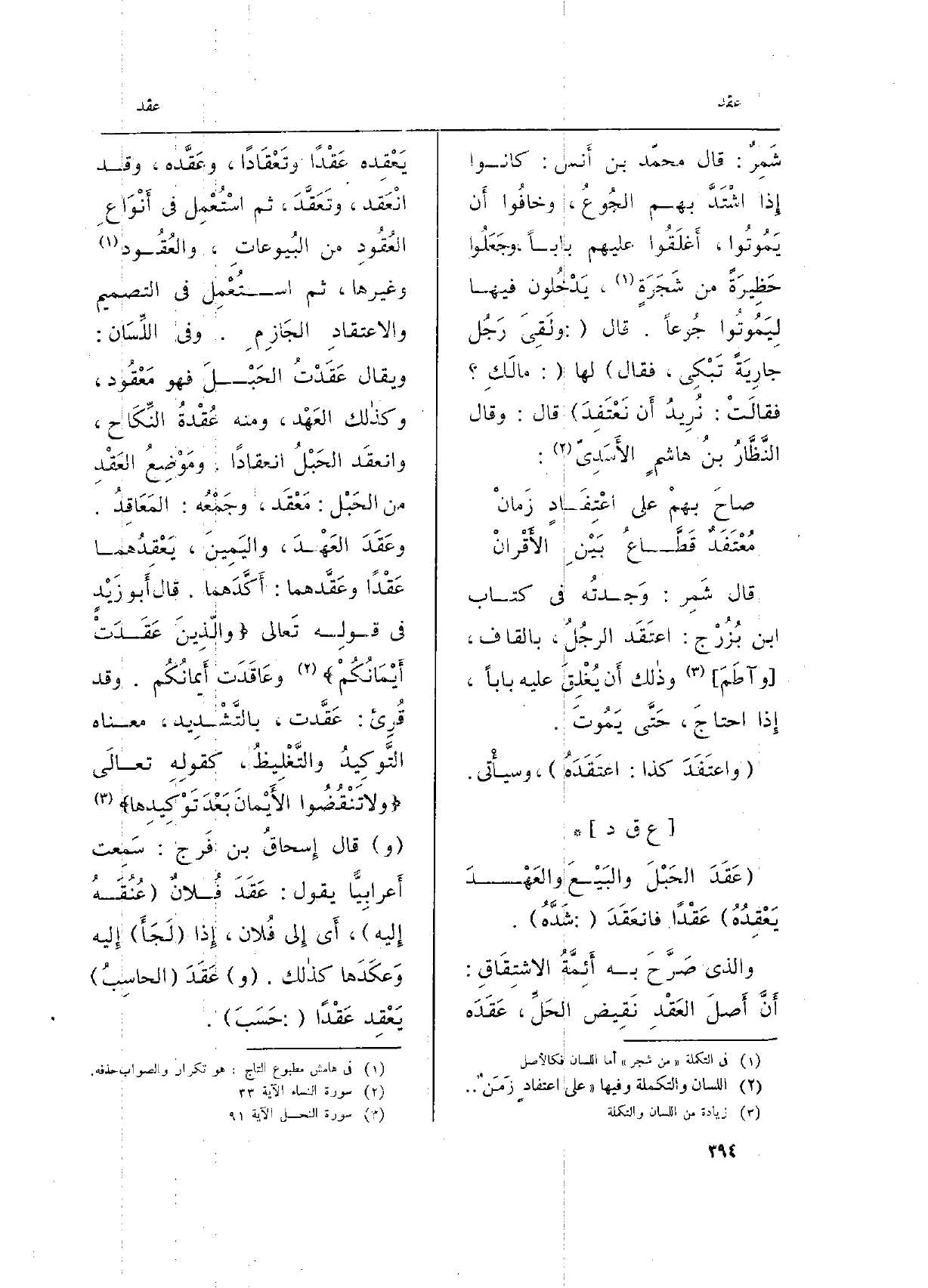 قَالَ أَبو زَيْد فِي قَوْله تَعَالَى: {وَالاْقْرَبُونَ وَالَّذِينَ عَقَدَتْ أَيْمَانُكُمْ} (النِّسَاء: 33) وعَاقَدَت أَيمانُكُم. وَقد قُرِىء: عَقَّدت، بالتشْدِيد، مَعْنَاهُ التَّوكِيدُ والتَّغْلِيظُ، كقولِهِ تعالَى: {وَلاَ تَنقُضُواْ الاْيْمَانَ بَعْدَ تَوْكِيدِهَا} (النَّحْل: 91) (و) قَالَ إِسحاقُ بن فَرج: سَمِعت أَعرابِيًّا يَقُول: قَدَ فُلانٌ (عُنُقَهُ إِليه) ، أَي إِلى فُلان، إِذا (لَجَأَ) إِليه وَعَكَدَها كذالك. (و) عَقَدَ (الحاسِبُ) يَعْقِد عَقْداً: (حَسَبَ) .