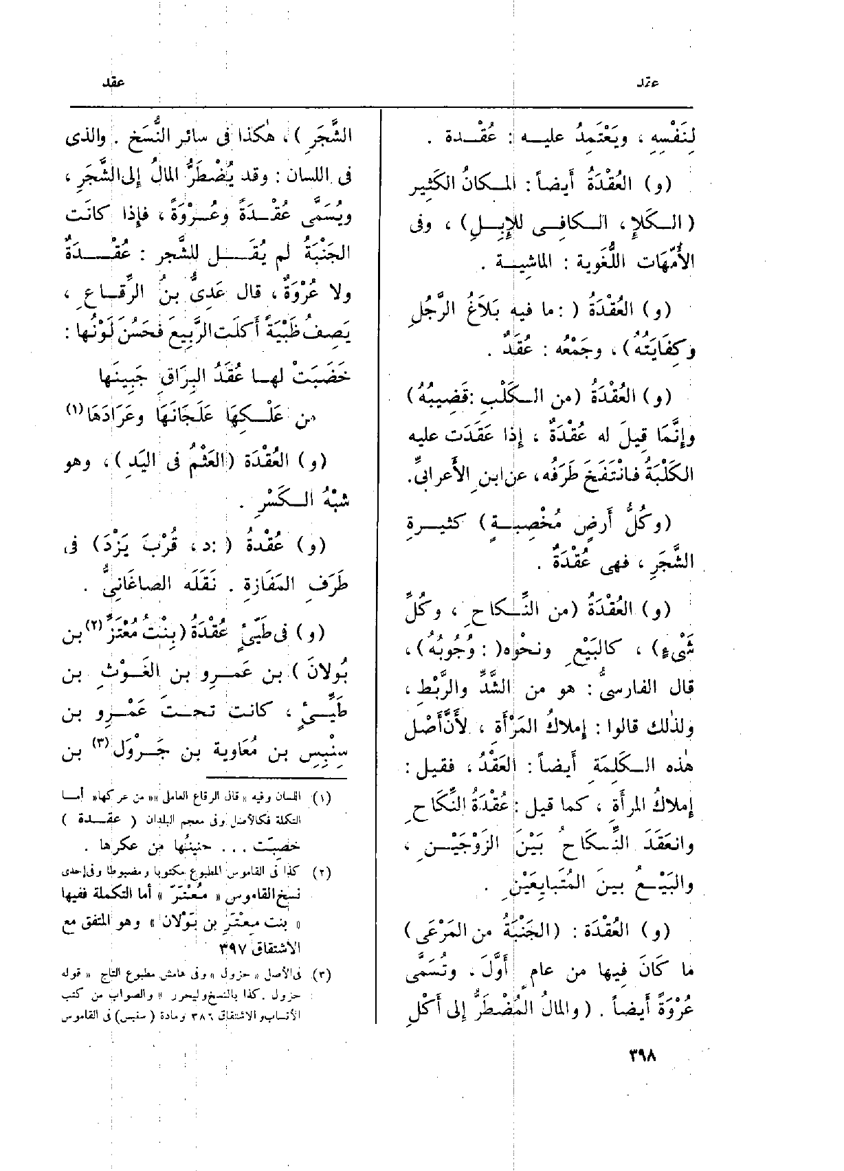 (و) العُقُدَةُ أَيضاً: المكانُ الكَثِير (الكَلإِ، الكافِي للإِبِلِ) ، وَفِي الإِمّهَات اللُّغَوي: الماشِية.