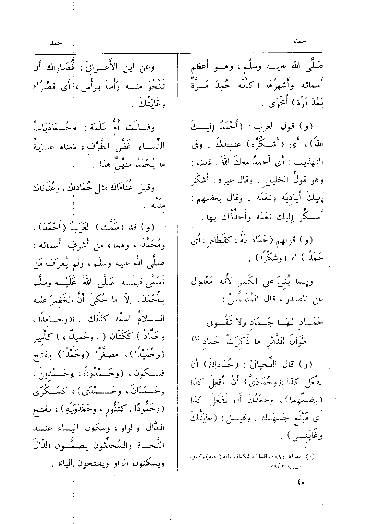 صَلَّى اللهُ عليّه وسلّم، وَهُوَ أَعظم أَسمائه وأَشهرُهَا (كأَنْ حُمِدَ مَرَّةً بَعْدَ مَرّة) أُخْرَى.