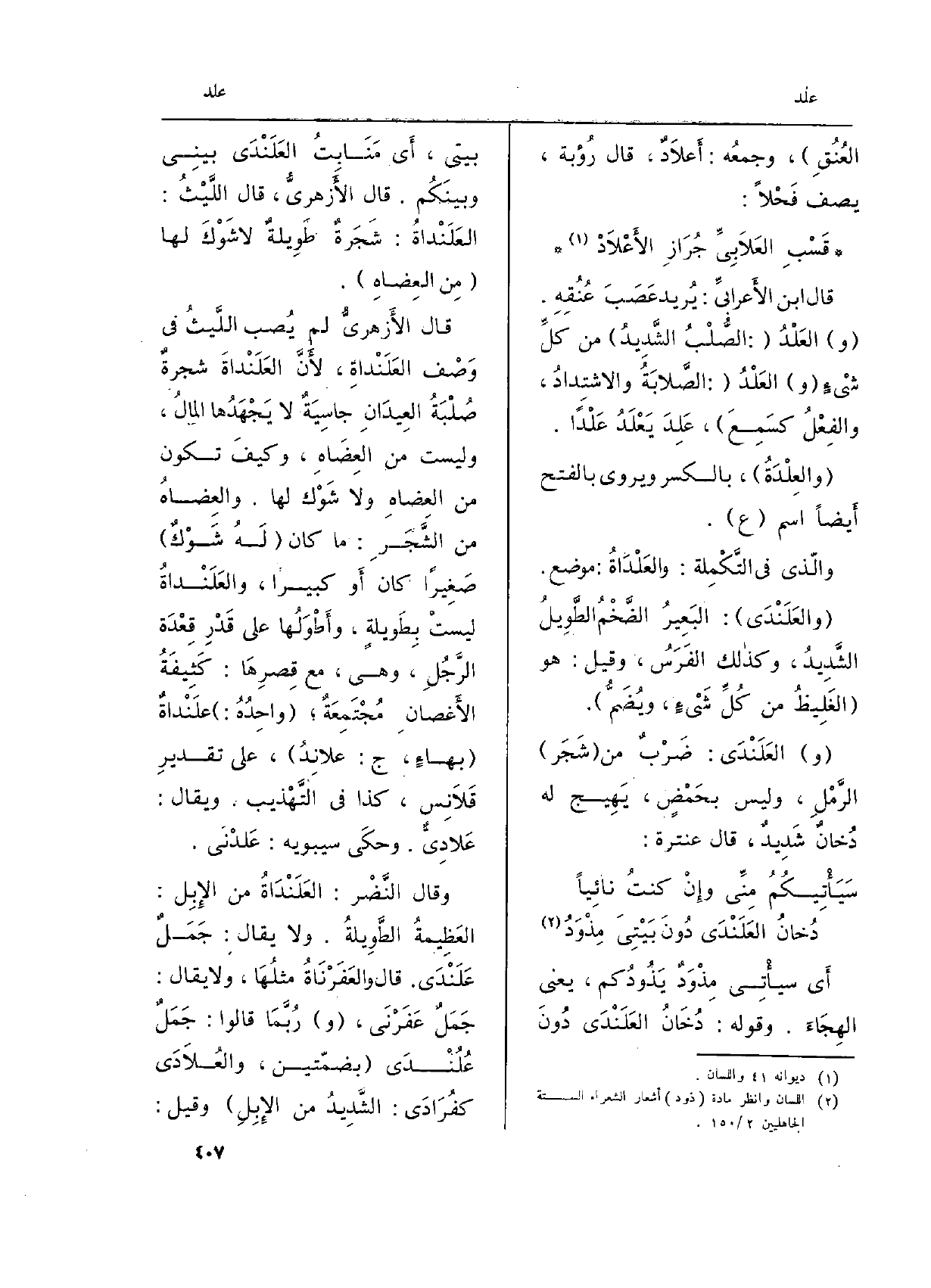 قَالَ الأَزهريُّ لم يخصب اللَّيثُ فِي وَصْف العَلَنْداةِ، لأَنَّ العَلَنْداةَ شجرةٌ صُلْبَةُ العِيدَانِ جاسِيَةٌ لَا يَجْهَدُها المالُ وَلَيْسَت من العِضَاهِ، وكيفَ تكون من العِضاهِ وَلَا شَوْك لَهَا. والعِضاهُ من الشَّجَرِ: مَا كَانَ (لَهُ شَوْكٌ) صَغِيراً كَانَ أَو كَبِيرا، والعَلَنْداةُ ليستْ بِطَويلةٍ، وأَطْوَلُها على قَدْرِ قِعْدَة الرَّجُلِ، وَهِي، مَعَ قِصرِهَا: كَثِيفَةُ الأَغصانِ مُجْتَمِعَةٌ؛ (واحِدُهُ) : علَنْداةٌ (بهاءٍ، ج: علانِدُ) ، على تقديرِ قَلَانِس، كَذَا فِي التَّهْذيب. وَيُقَال: عَلادِيٌّ. وحكَى سِيبَوَيْهٍ: عَلدْنَى.