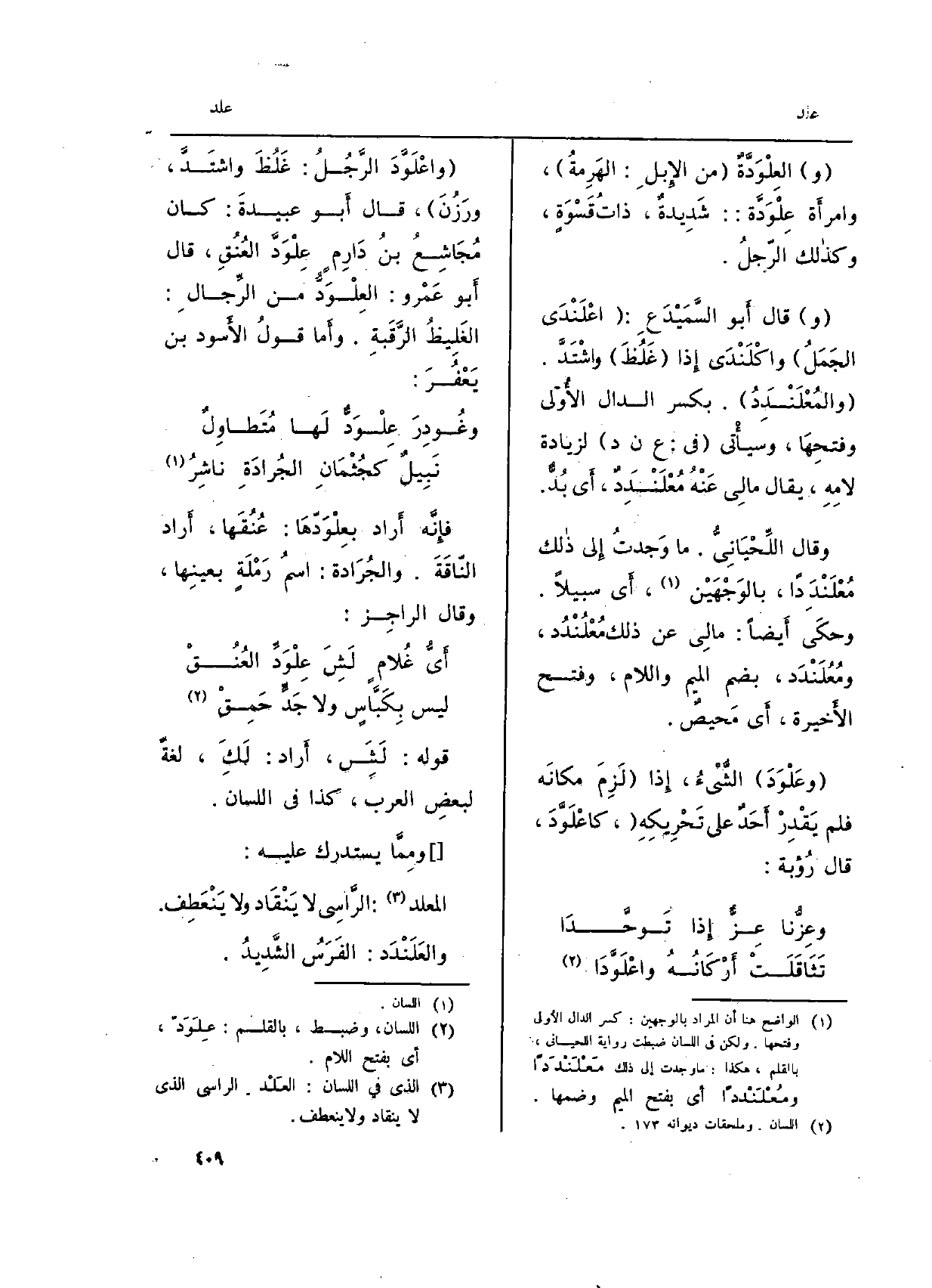 وعِزُّنا عِزٌّ إِذا تَوحَّدَا تَثَاقَلَتْ أَرْكَانُهُ واعْلَوَّدَا (واعْلَوَّدَ الرَّجُلُ: غَلُظَ اشتَدَّ، ورَزُنَ) ، قَالَ أَبو عبيدةَ: كَانَ مُجَاشِعُ بنُ دَرِمٍ عِلْوَدَّ العُنُقِ، قَالَ أَبو عَمْرو: العِلْوَدُّ من الرِّجالِ: الغَلِيظُ الرَّقَبةِ. وأَما قولُ الأَسود بن يَعْفُرَ: