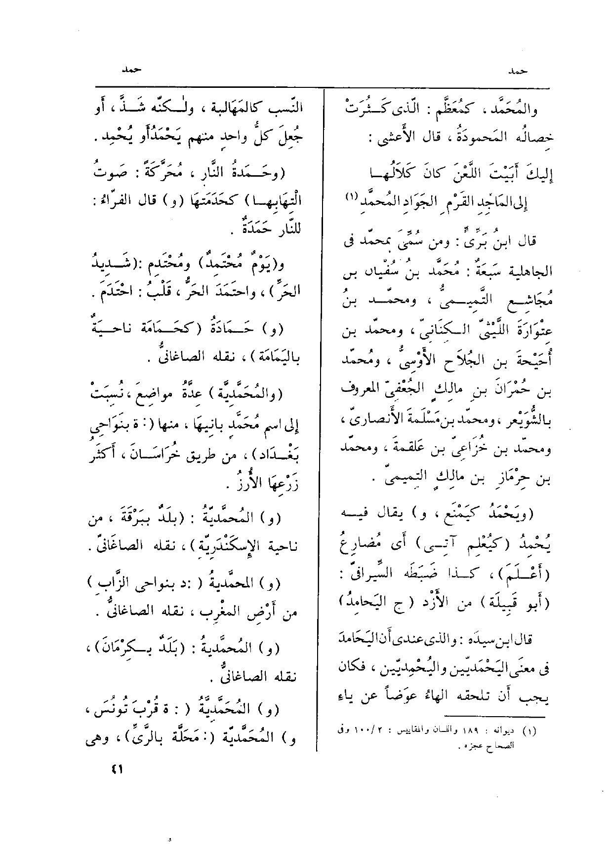 قَالَ ابْن سيدَه: وَالَّذِي عِنْدِي أَن اليَحَامدَ فِي معنَى اليَحْمَديّين واليُحْمِديّين، فَكَانَ يجب أَن تلْحقهُ الهاءُ عوَضاً عَن ياءِ النّسب كالمَهَالبة، ولاكنه شَذَّ، أَو جُعِلَ كلُّ واحدٍ مِنْهُم يَحْمَدُ أَو يُحْمد.