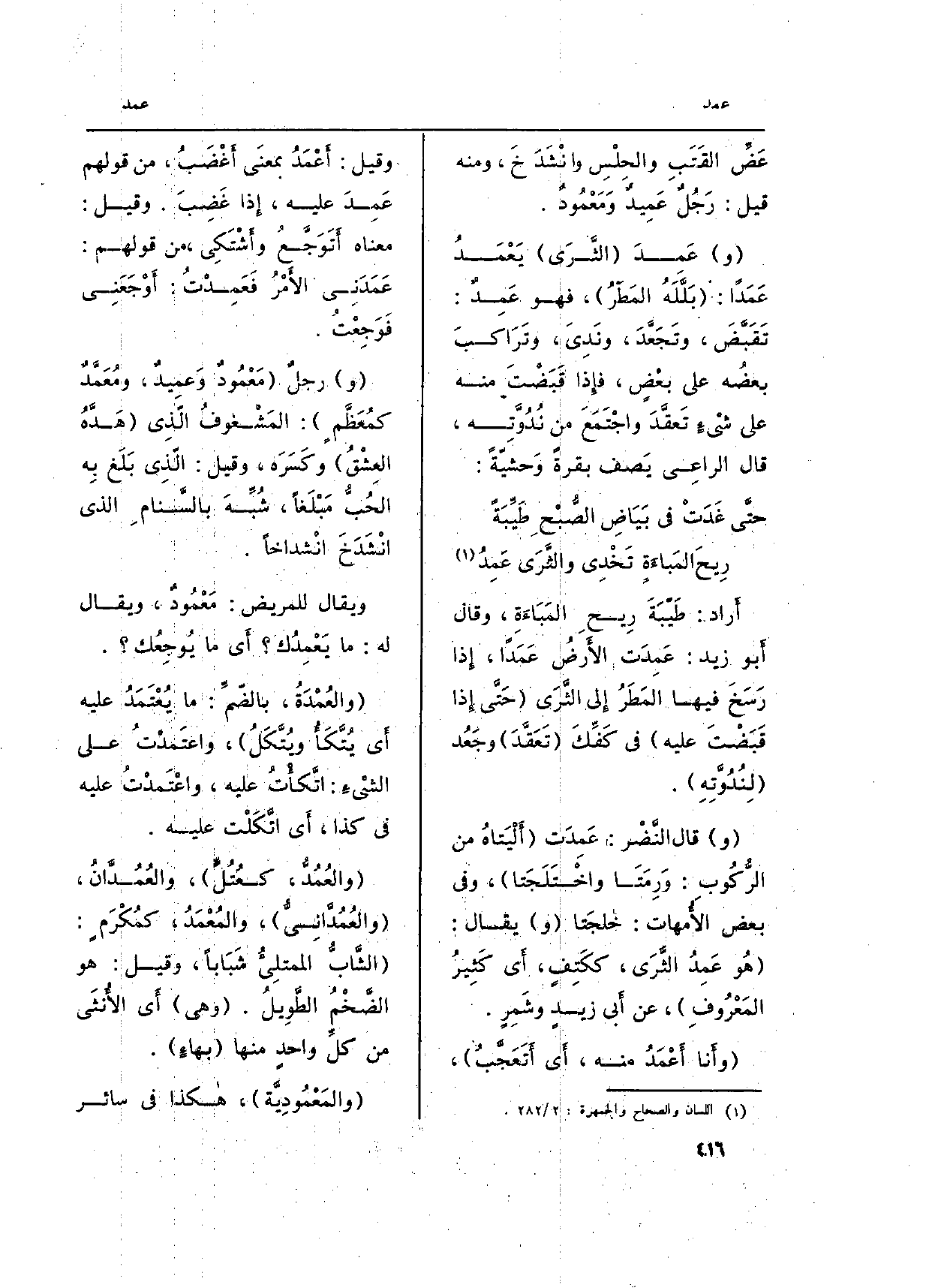 وقولُه تَعَالَى: {إِرَمَ ذَاتِ الْعِمَادِ} (الْفجْر: 7) قيل: مَعْنَاهُ ذَا لاطُّول، وَقيل ذاتُ البِناءِ الرَّفيع المُعْمَد. وَجمعه: عُمُدٌ. وَقَالَ الفرّاءُ: ذاتُ العمَاد: أَنهم كَانُوا أَهْلَ عَمَدٍ يَنْتَقلُون إِلى الكَلَإِ حيثُ كَانَ، ثمَّ يَرْجِعُون إِلى مَنازلهم.