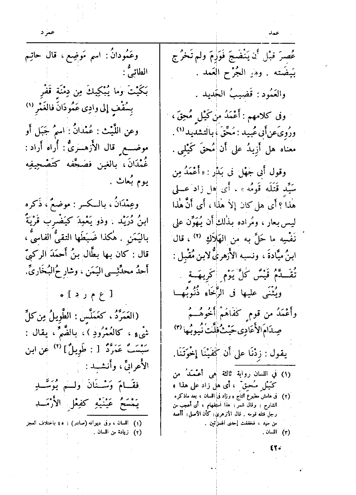 (وعَمُودُ الْبَانِ، وعَمُودُ السَّفْحِ: جَبَلانِ طوِيلانِ، لَا يَرْقَاهُمَا إِلَّا طائِرٌ) لِعُلُوِّهما. وَمن ذالك قَوْلهم: (العُقَابُ يَبِيضُ فِي رأْسٍ عَمُودٍ) والمُرادُ بِهِ الجَبَلُ المُسْتَدِقُّ المُصْعِدُ فِي السّماء.